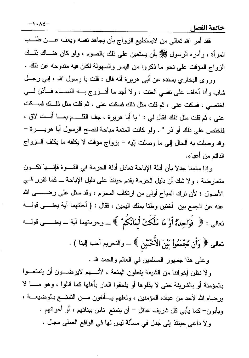 وروى البخاري بسنده عن أبى هريرة أنه قال: قلت يا رسول الله، إني رجل شاب وأنا أخاف على نفسي العنت، ولا أجد ما أتزوج به النساء فأذن لي اختصي، فسكت عنى، ثم قلت مثل ذلك فسكت عنى، ثم قلت مثل ذلك فسكت عنى، ثم قلت مثل ذلك فقال لي: " يا أبا هريرة، جف القلم بما أنت لاق، فاختص على ذلك أو ذر ". ولو كانت المتعة مباحة لنصح الرسول أبا هريرة - وقد وصلت به الحال إلى ما وصلت إليه - بزواج مؤقت لا يكلفه ما يكلف الزواج الدائم من أعباء.