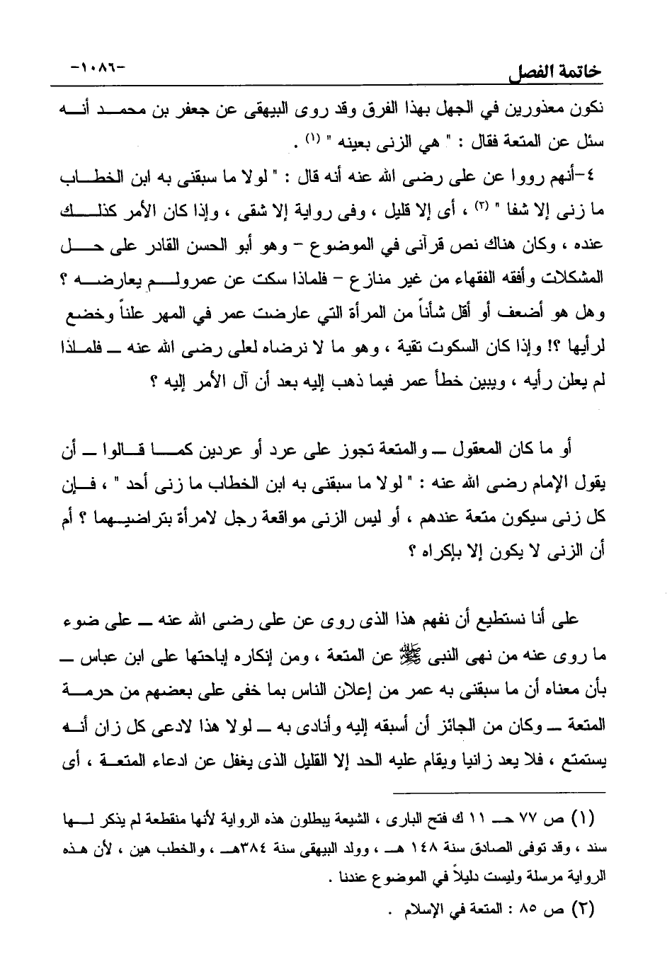 وما كان المعقول ـ والمتعة تجوز على عرد أو عردين كما قالوا ـ أن يقول الإمام رضي الله عنه: " لولا ما سبقنى به ابن الخطاب ما زنى أحد "، فإن كل زنى سيكون متعة عندهم، أو ليس الزنى مواقعة رجل لامرأة بتراضيهما؟ أم أن الزنى لا يكون إلا بإكراه؟