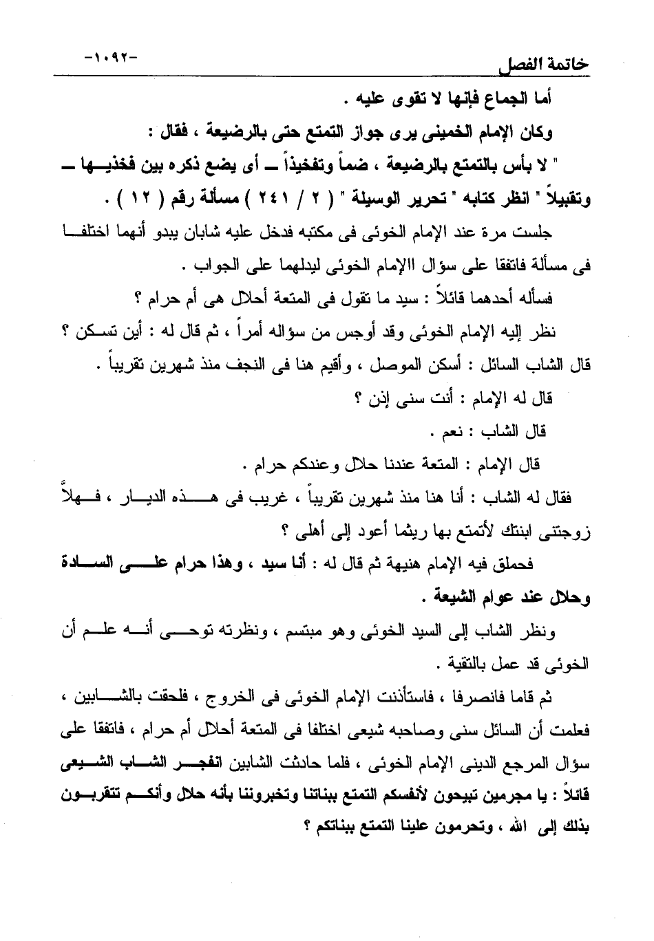 ثم قاما فانصرفا، فاستأذنت الإمام الخوئى فى الخروج، فلحقت بالشابين، فعلمت أن السائل سني وصاحبه شيعى اختلفا فى المتعة أحلال أم حرام، فاتفقا على سؤال المرجع الدينى الإمام الخوئى، فلما حادثت الشابين انفجر الشاب الشيعى قائلاً: يا مجرمين تبيحون لأنفسكم التمتع ببناتنا وتخبروننا بأنه حلال وأنكم تتقربون بذلك إلى الله، وتحرمون علينا التمتع ببناتكم؟
