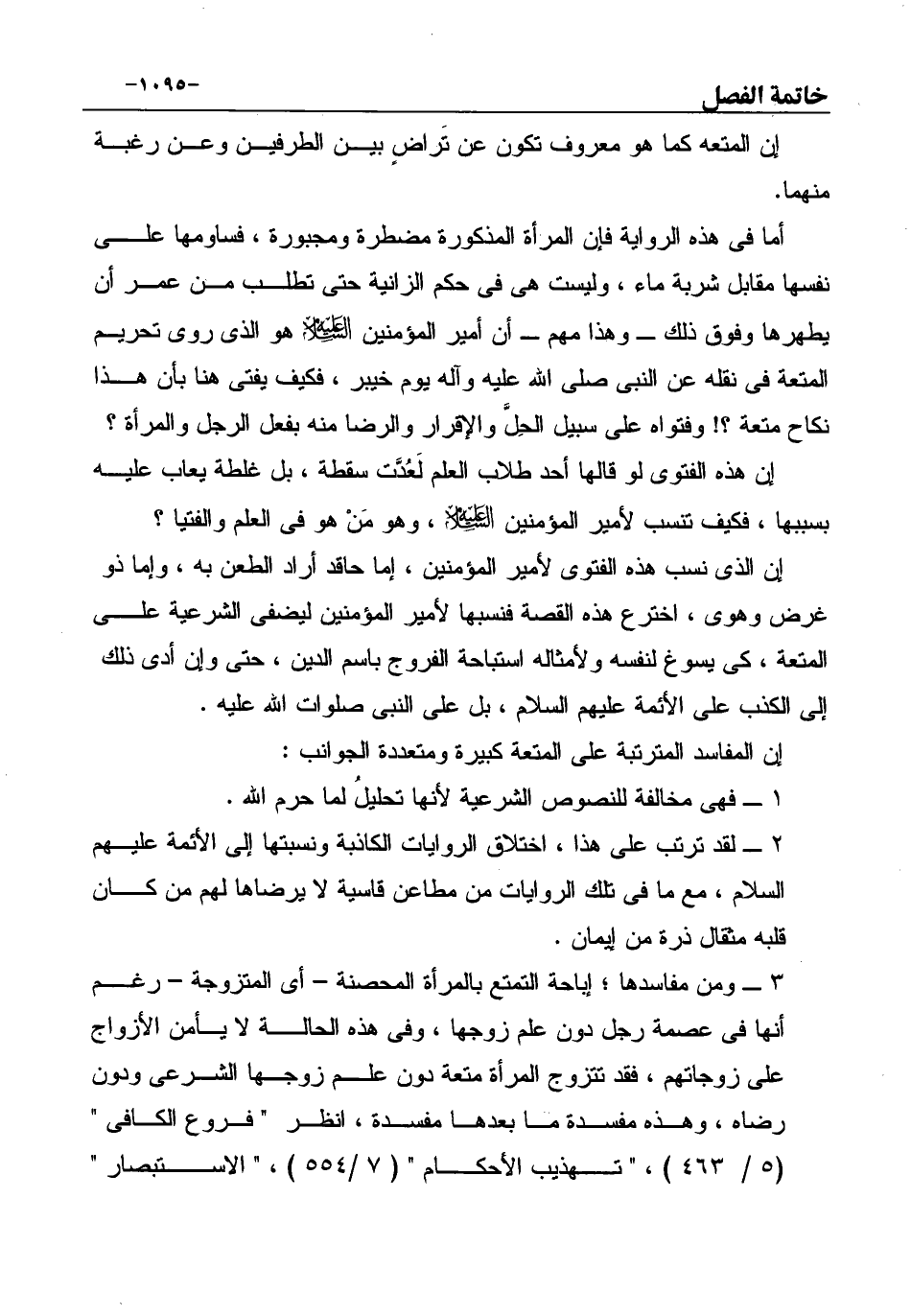 3 ـ ومن مفاسدها؛ إباحة التمتع بالمرأة المحصنة - أي المتزوجة - رغم أنها فى عصمة رجل دون علم زوجها، وفى هذه الحالة لا يأمن الأزواج على زوجاتهم، فقد تتزوج المرأة متعة دون علم زوجها الشرعي ودون رضاه، وهذه مفسدة ما بعدها مفسدة، انظر " فروع الكافى " (5 / 463) ، " تهذيب الأحكام " (7 /554) ، " الاستبصار " ... (3/145) ،