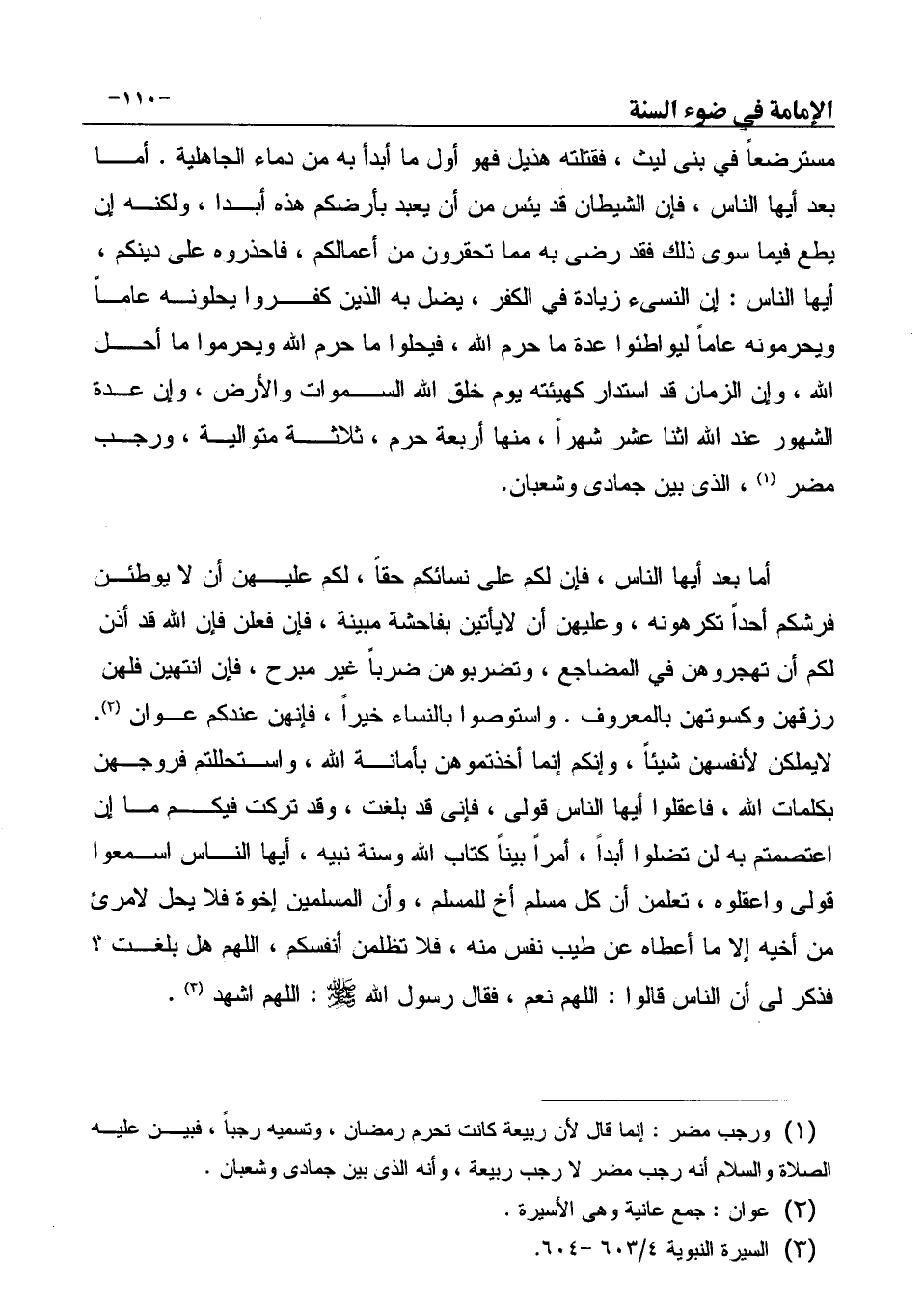 مسترضعاً في بنى ليث، فقتلته هذيل فهو أول ما أبدأ به من دماء الجاهلية. أما بعد أيها الناس، فإن الشيطان قد يئس من أن يعبد بأرضكم هذه أبدا، ولكنه إن يطع فيما سوى ذلك فقد رضى به مما تحقرون من أعمالكم، فاحذروه على دينكم، أيها الناس: إن النسىء زيادة في الكفر، يضل به الذين كفروا يحلونه عاماً ويحرمونه عاماً ليواطئوا عدة ما حرم الله، فيحلوا ما حرم الله ويحرموا ما أحل الله، وإن الزمان قد استدار كهيئته يوم خلق الله السموات والأرض، وإن عدة الشهور عند الله اثنا عشر شهراً، منها أربعة حرم، ثلاثة متوالية، ورجب ... مضر (¬1) ، الذي بين جمادى وشعبان.