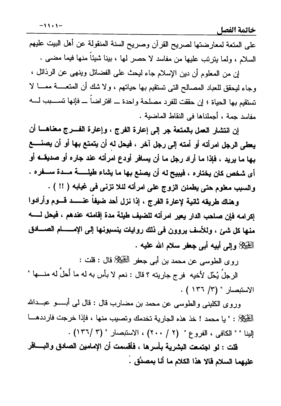 وهناك طريقه ثانية لإعارة الفرج، إذا نزل أحد ضيفاً عند قوم وأرادوا إكرامه فإن صاحب الدار يعير امرأته للضيف طيلة مدة إقامته عندهم، فيحل له منها كل شئ، وللأسف يروون فى ذلك روايات ينسبونها إلى الإمام الصادق - عليه السلام - وإلى أبيه أبى جعفر سلام الله عليه.