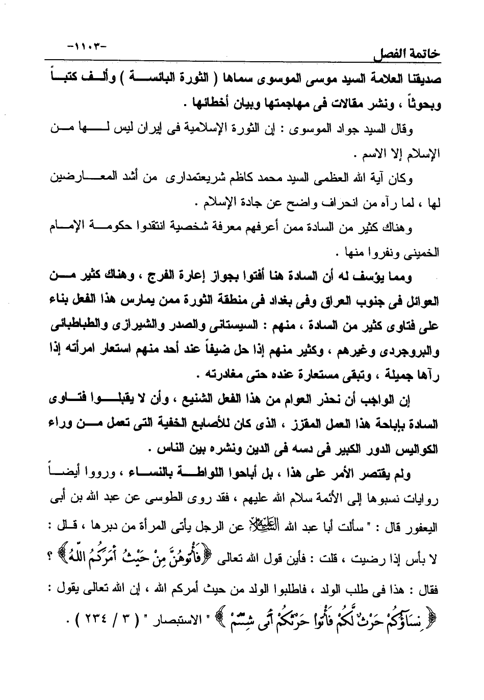 ومما يؤسف له أن السادة هنا أفتوا بجواز إعارة الفرج، وهناك كثير من العوائل فى جنوب العراق وفى بغداد فى منطقة الثورة ممن يمارس هذا الفعل بناء على فتاوى كثير من السادة، منهم: السيستانى والصدر والشيرازى والطباطبائى والبروجردى وغيرهم، وكثير منهم إذا حل ضيفاً عند أحد منهم استعار امرأته إذا رآها جميلة، وتبقى مستعارة عنده حتى مغادرته.