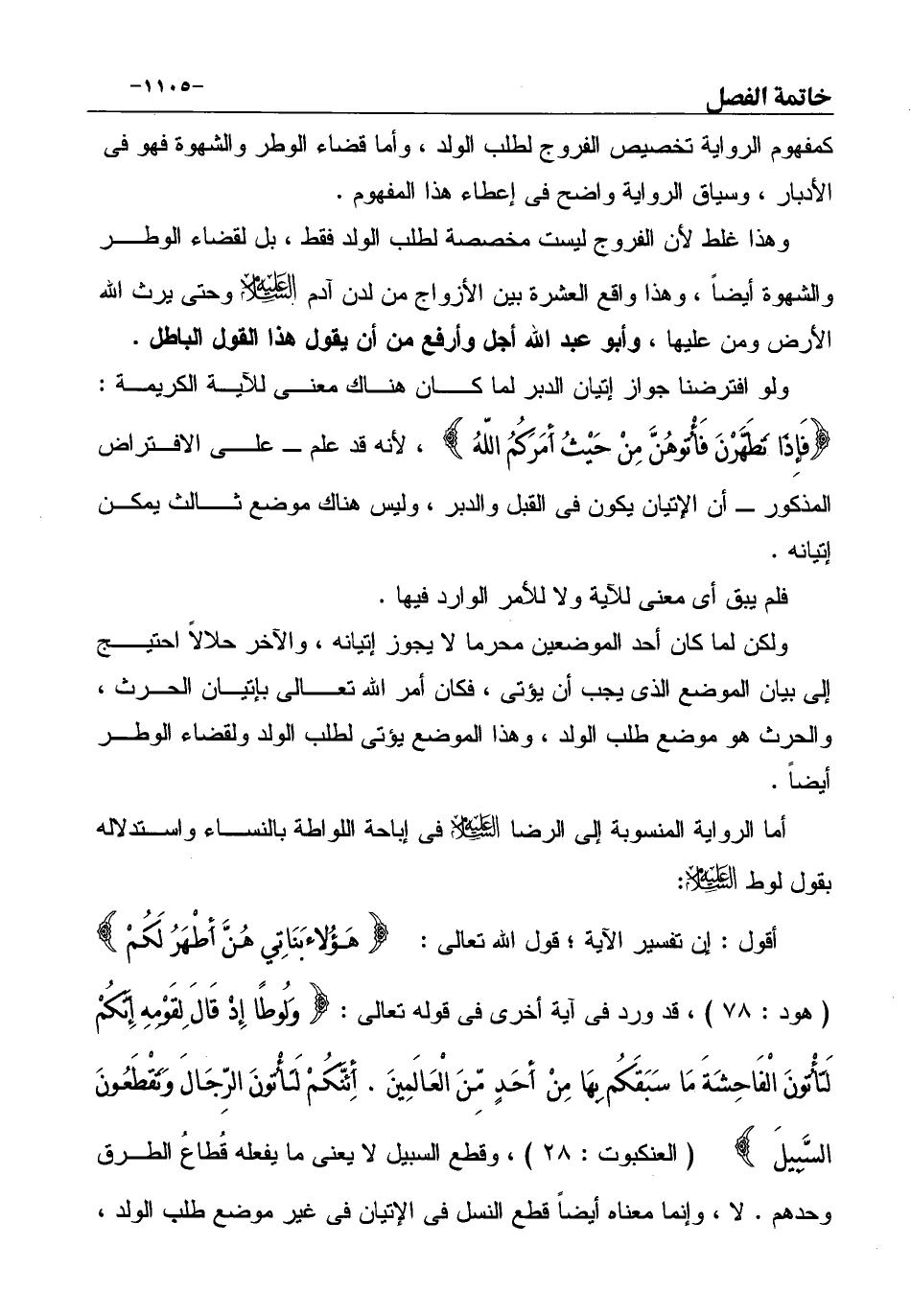 وهذا غلط لأن الفروج ليست مخصصة لطلب الولد فقط، بل لقضاء الوطر والشهوة أيضاً، وهذا واقع العشرة بين الأزواج من لدن آدم - عليه السلام - وحتى يرث الله الأرض ومن عليها، وأبو عبد الله أجل وأرفع من أن يقول هذا القول الباطل.
