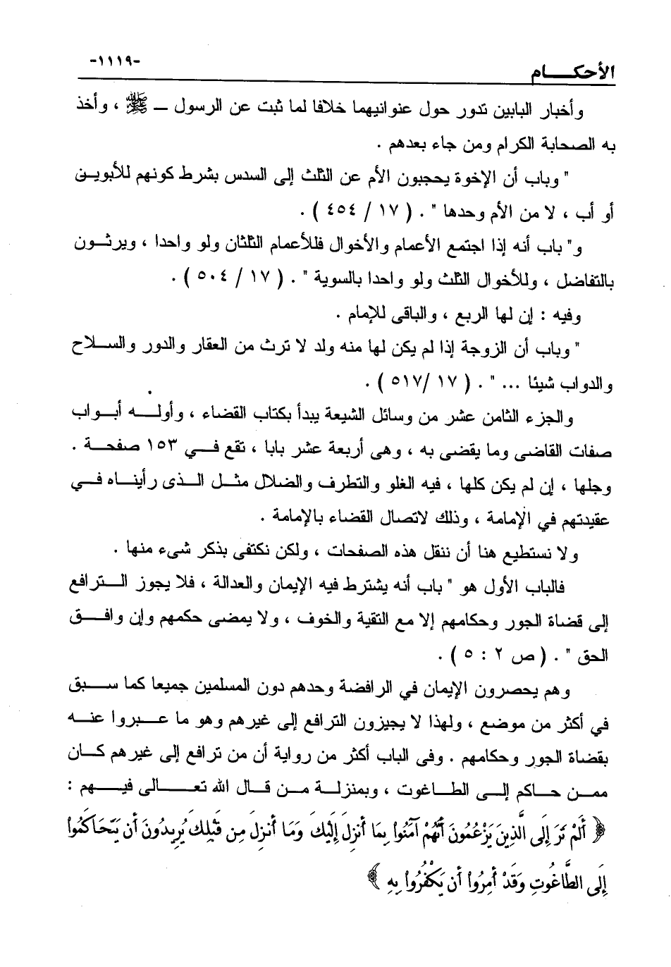 وهم يحصرون الإيمان في الرافضة وحدهم دون المسلمين جميعا كما سبق في أكثر من موضع، ولهذا لا يجيزون الترافع إلى غيرهم وهو ما عبروا عنه بقضاة الجور وحكامهم. وفى الباب أكثر من رواية أن من ترافع إلى غيرهم كان ممن حاكم إلى الطاغوت، وبمنزلة من قال الله تعالى فيهم: "" أَلَمْ تَرَ إِلَى الَّذِينَ يَزْعُمُونَ أَنَّهُمْ آمَنُواْ بِمَا أُنزِلَ إِلَيْكَ وَمَا أُنزِلَ مِن قَبْلِكَ يُرِيدُونَ أَن يَتَحَاكَمُواْ إِلَى الطَّاغُوتِ وَقَدْ أُمِرُواْ أَن يَكْفُرُواْ بِهِ ""
