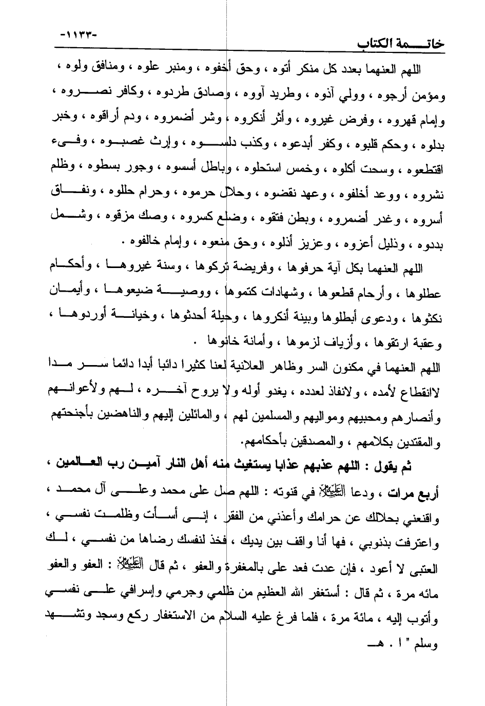ثم يقول: اللهم عذبهم عذابا يستغيث منه أهل النار آمين رب العالمين، أربع مرات، ودعا - عليه السلام - في قنوته: اللهم صل على محمد وعلى آل محمد، واقنعني بحلالك عن حرامك وأعذني من الفقر، إنى أسأت وظلمت نفسي، واعترفت بذنوبي، فها أنا واقف بين يديك، فخذ لنفسك رضاها من نفسي، لك العتبى لا أعود، فإن عدت فعد على بالمغفرة والعفو، ثم قال - عليه السلام -: العفو والعفو مائه مرة، ثم قال: أستغفر الله العظيم من ظلمي وجرمي وإسرافي على نفسي وأتوب إليه، مائة مرة، فلما فرغ عليه السلام من الاستغفار ركع وسجد وتشهد وسلم " ا. هـ