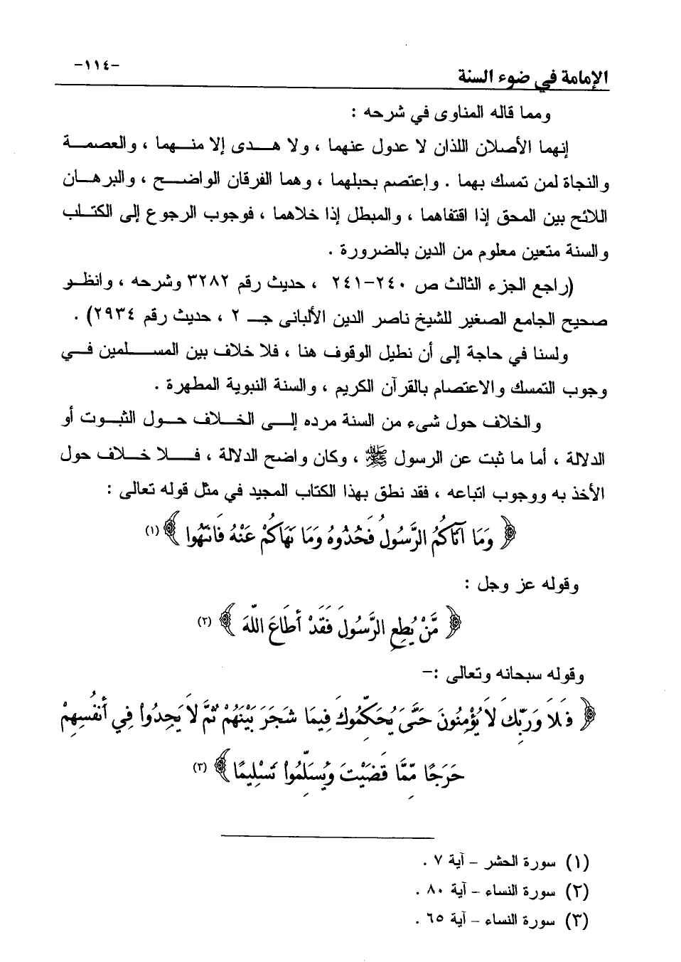إنهما الأصلان اللذان لا عدول عنهما، ولا هدى إلا منهما، والعصمة والنجاة لمن تمسك بهما. واعتصم بحبلهما، وهما الفرقان الواضح، والبرهان اللائح بين المحق إذا اقتفاهما، والمبطل إذا خلاهما، فوجوب الرجوع إلى الكتاب والسنة متعين معلوم من الدين بالضرورة.