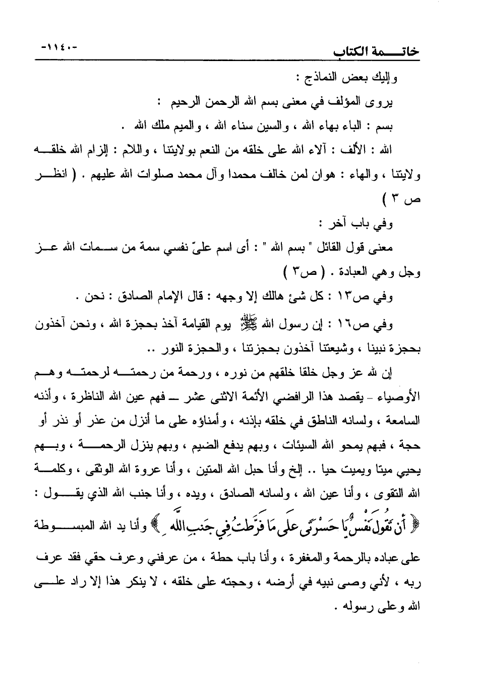 إن لله عز وجل خلقا خلقهم من نوره، ورحمة من رحمته لرحمته وهم الأوصياء - يقصد هذا الرافضي الأئمة الاثنى عشر ـ فهم عين الله الناظرة، وأذنه السامعة، ولسانه الناطق في خلقه بإذنه، وأمناؤه على ما أنزل من عذر أو نذر أو حجة، فبهم يمحو الله السيئات، وبهم يدفع الضيم، وبهم ينزل الرحمة، وبهم يحيي ميتا ويميت حيا.. إلخ وأنا حبل الله المتين، وأنا عروة الله الوثقى، وكلمة الله التقوى، وأنا عين الله، ولسانه الصادق، ويده، وأنا جنب الله الذي يقول: " أَن تَقُولَ نَفْسٌ يَا حَسْرَتَى علَى مَا فَرَّطتُ فِي جَنبِ اللَّه ِ" وأنا يد الله المبسوطة على عباده بالرحمة والمغفرة، وأنا باب حطة، من عرفني وعرف حقي فقد عرف ربه، لأني وصى نبيه في أرضه، وحجته على خلقه، لا ينكر هذا إلا راد على الله وعلى رسوله.