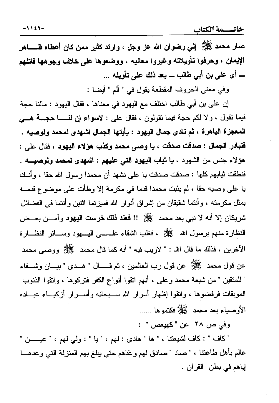 إن على بن أبي طالب اختلف مع اليهود في معناها، فقال اليهود: مالنا حجة فيما نقول، ولا لكم حجة فيما تقولون، فقال على: لاسواء إن لنا حجة هي المعجزة الباهرة، ثم نادى جمال اليهود: يأيتها الجمال اشهدى لمحمد ولوصيه. فتبادر الجمال: صدقت صدقت، يا وصى محمد وكذب هؤلاء اليهود، فقال على: هؤلاء جنس من الشهود، يا ثياب اليهود التي عليهم: اشهدى لمحمد ولوصيه. فنطقت ثيابهم كلها: صدقت صدقت يا على نشهد أن محمدا رسول الله حقا، وأنك يا على وصيه حقا، لم يثبت محمدا قدما في مكرمة إلا وطأت على موضوع قدمه بمثل مكرمته، وأنتما شقيقان من إشراق أنوار الله فميزتما اثنين وأنتما في الفضائل شريكان إلا أنه لا نبي بعد محمد - صَلَّى اللهُ عَلَيْهِ وَسَلَّمَ -!! فعند ذلك خرست اليهود وآمن بعض النظارة منهم برسول الله - صَلَّى اللهُ عَلَيْهِ وَسَلَّمَ -، فغلب الشقاء على اليهود وسائر النظارة الآخرين، فذلك ما قال الله: " لاريب فيه " أنه كما قال محمد - صَلَّى اللهُ عَلَيْهِ وَسَلَّمَ - ووصى محمد عن قول محمد - صَلَّى اللهُ عَلَيْهِ وَسَلَّمَ - عن قول رب العالمين، ثم قال " هدى " بيان وشفاء " للمتقين " من شيعة محمد وعلى، أنهم اتقوا أنواع الكفر فتركوها، واتقوا الذنوب الموبقات فرفضوها، واتقوا إظهار أسرار الله سبحانه وأسرار أزكياء عباده الأوصياء بعد محمد - صَلَّى اللهُ عَلَيْهِ وَسَلَّمَ - فكتموها