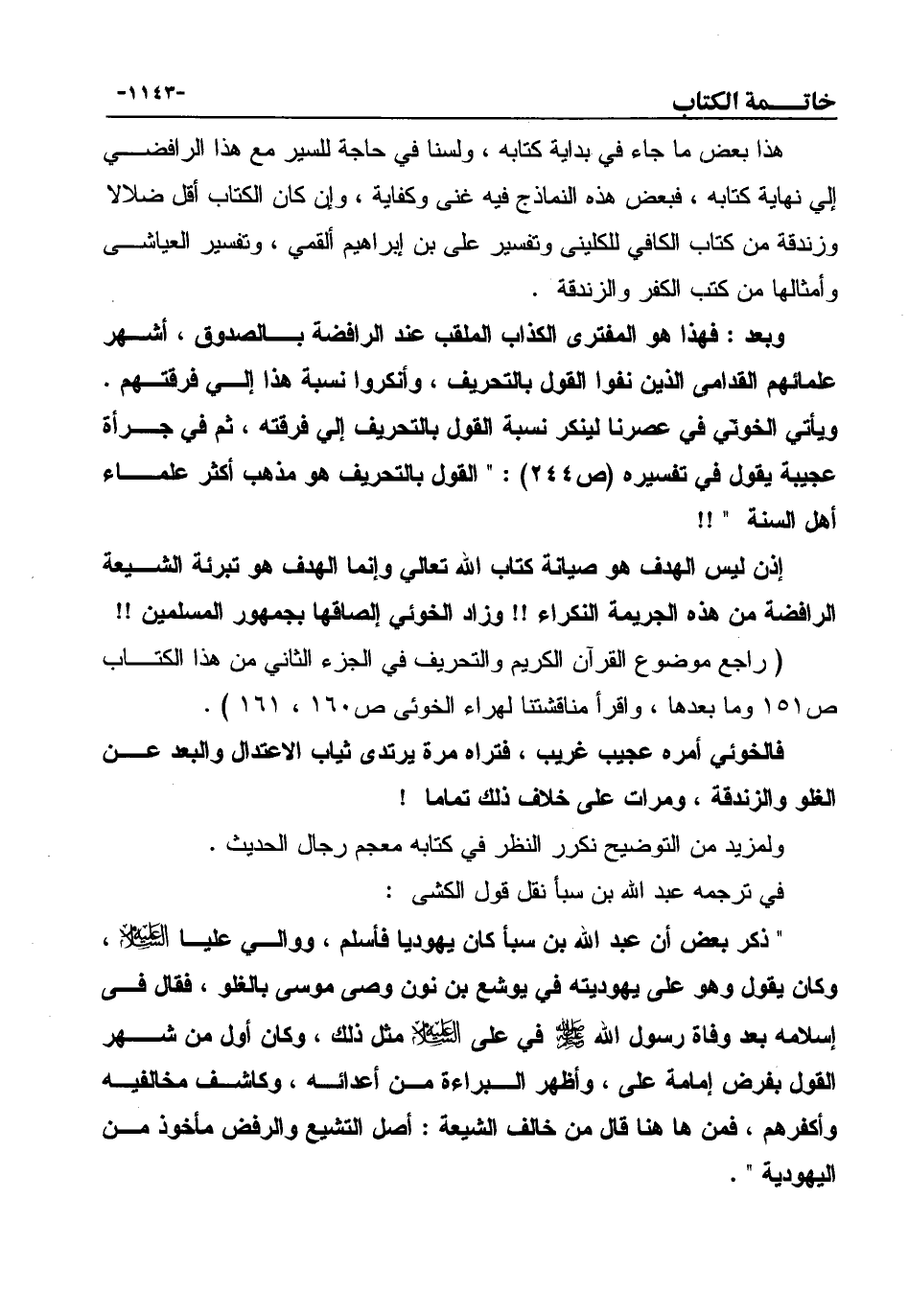 هذا بعض ما جاء في بداية كتابه، ولسنا في حاجة للسير مع هذا الرافضي إلي نهاية كتابه، فبعض هذه النماذج فيه غنى وكفاية، وإن كان الكتاب أقل ضلالا وزندقة من كتاب الكافي للكلينى وتفسير على بن إبراهيم ألقمي، وتفسير العياشى وأمثالها من كتب الكفر والزندقة.