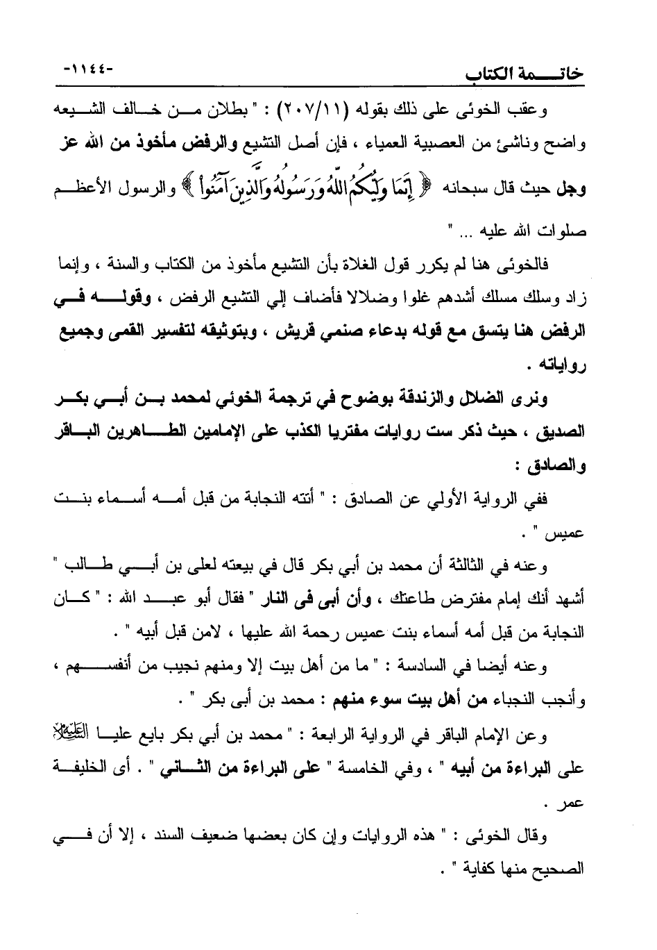 وعقب الخوئى على ذلك بقوله (11/207) : " بطلان من خالف الشيعه واضح وناشئ من العصبية العمياء، فإن أصل التشيع والرفض مأخوذ من الله عز وجل حيث قال سبحانه "" إِنَّمَا وَلِيُّكُمُ اللهُ وَرَسُولُهُ وَالَّذِينَ آمَنُواْ "" والرسول الأعظم صلوات الله عليه ... "