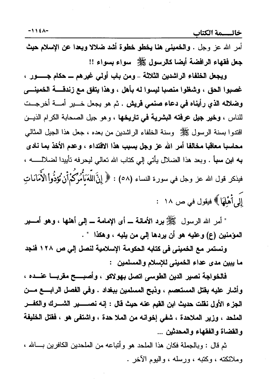 ويجعل الخلفاء الراشدين الثلاثة - ومن باب أولي غيرهم ـ حكام جور، غصبوا الحق، وشغلوا منصبا ليسوا له بأهل، وهذا يتفق مع زندقة الخمينى وضلاله الذي رأيناه في دعاء صنمي قريش. ثم هو يجعل خير أمة أخرجت للناس، وخير جيل عرفته البشرية في تاريخها، وهو جيل الصحابة الكرام الذين اقتدوا بسنة الرسول - صَلَّى اللهُ عَلَيْهِ وَسَلَّمَ - وسنة الخلفاء الراشدين من بعده، جعل هذا الجيل المثالي محاسبا معاقبا مخالفا أمر الله عز وجل بسبب هذا الاقتداء، وعدم الأخذ بما نادى به ابن سبأ. وبعد هذا الضلال يأتي إلي كتاب الله تعالي ليحرفه تأييدا لضلاله، فيذكر قول الله عز وجل في سورة النساء (58) : "" إِنَّ اللهَ يَأْمُرُكُمْ أَن تُؤدُّواْ الأَمَانَاتِ إِلَى أَهْلِهَا"" فيقول في ص 18: