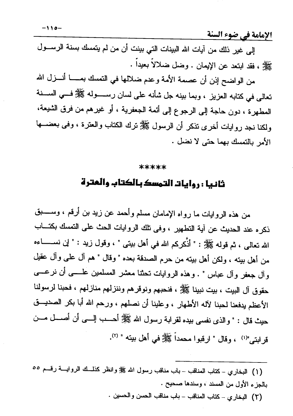 من الواضح إذن أن عصمة الأمة وعدم ضلالها في التمسك بما أنزل الله تعالى في كتابه العزيز، وبما بينه جل شأنه على لسان رسوله صَلَّى اللهُ عَلَيْهِ وَسَلَّمَ في السنة المطهرة، دون حاجة إلى الرجوع إلى أئمة الجعفرية، أو غيرهم من فرق الشيعة، ولكنا نجد روايات أخرى تذكر أن الرسول صَلَّى اللهُ عَلَيْهِ وَسَلَّمَ ترك الكتاب والعترة، وفى بعضها الأمر بالتمسك بهما حتى لا نضل.