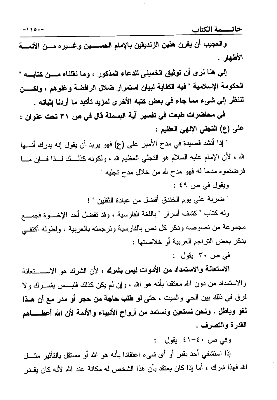 إلي هنا نرى أن توثيق الخمينى للدعاء المذكور، وما نقلناه من كتابه " الحكومة الإسلامية " فيه الكفاية لبيان استمرار ضلال الرافضة وغلوهم، ولكن لننظر إلي شيىء مما جاء في بعض كتبه الأخرى لمزيد تأكيد ما أردنا إثباته.