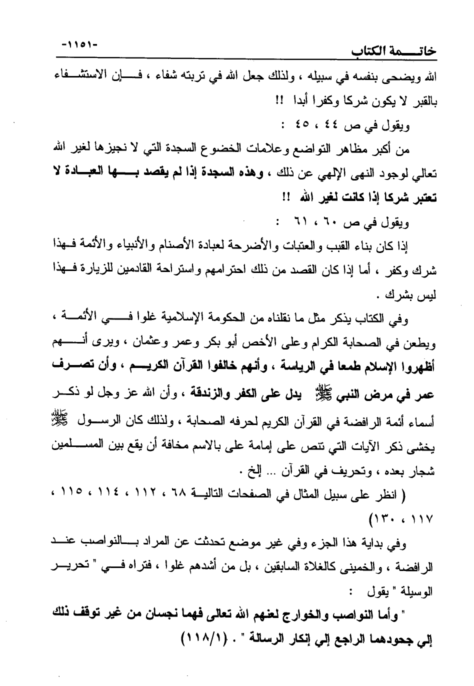 ويقول في ص 60، 61: إذا كان بناء القبب والعتبات والأضرحة لعبادة الأصنام والأنبياء والأئمة فهذا شرك وكفر، أما إذا كان القصد من ذلك احترامهم واستراحة القادمين للزيارة فهذا ليس بشرك.
