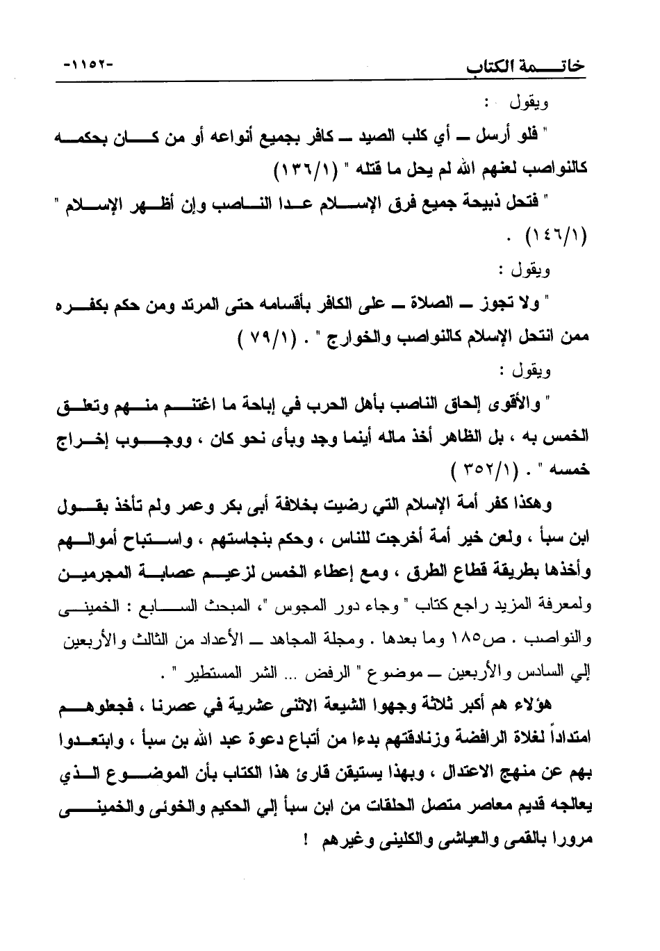 وهكذا كفر أمة الإسلام التي رضيت بخلافة أبى بكر وعمر ولم تأخذ بقول ابن سبأ، ولعن خير أمة أخرجت للناس، وحكم بنجاستهم، واستباح أموالهم وأخذها بطريقة قطاع الطرق، ومع إعطاء الخمس لزعيم عصابة المجرمين ولمعرفة المزيد راجع كتاب " وجاء دور المجوس "، المبحث السابع: الخمينى والنواصب. ص185 وما بعدها. ومجلة المجاهد ـ الأعداد من الثالث والأربعين إلي السادس والأربعين ـ موضوع " الرفض ... الشر المستطير ".