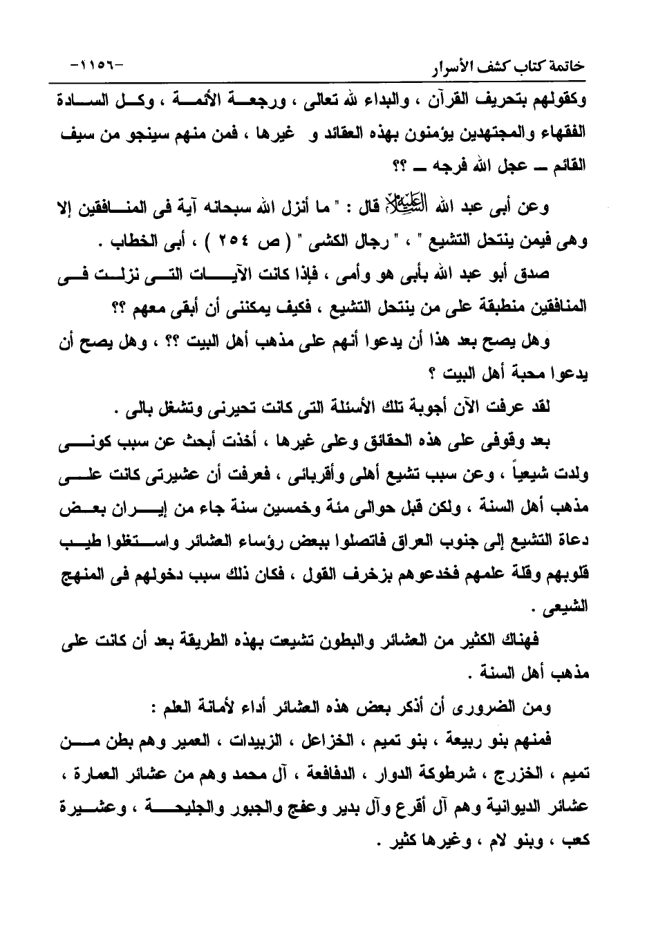 بعد وقوفى على هذه الحقائق وعلى غيرها، أخذت أبحث عن سبب كونى ولدت شيعياً، وعن سبب تشيع أهلى وأقربائى، فعرفت أن عشيرتى كانت على مذهب أهل السنة، ولكن قبل حوالى مئة وخمسين سنة جاء من إيران بعض دعاة التشيع إلى جنوب العراق فاتصلوا ببعض رؤساء العشائر واستغلوا طيب قلوبهم وقلة علمهم فخدعوهم بزخرف القول، فكان ذلك سبب دخولهم فى المنهج الشيعى.
