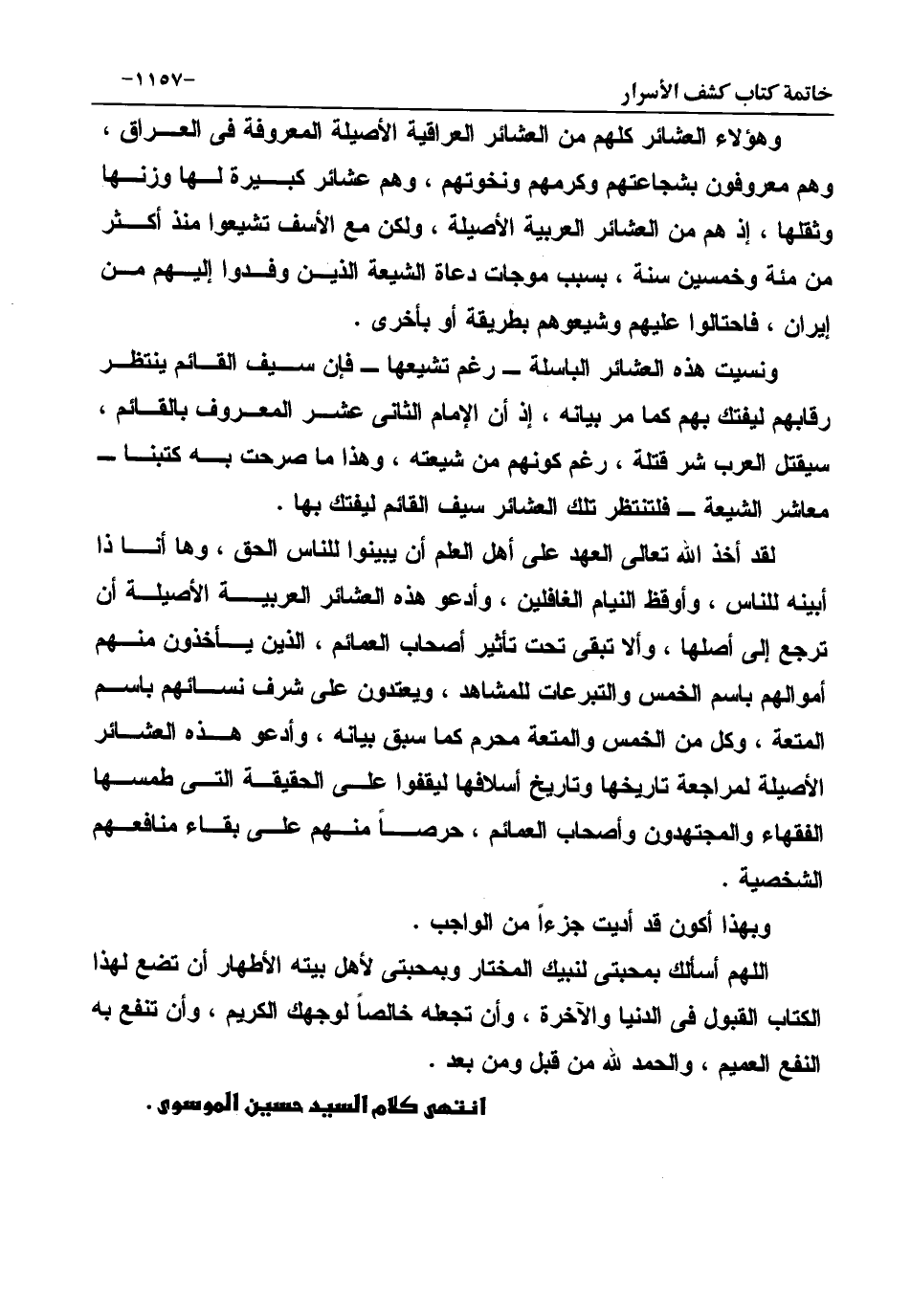 لقد أخذ الله تعالى العهد على أهل العلم أن يبينوا للناس الحق، وها أنا ذا أبينه للناس، وأوقظ النيام الغافلين، وأدعو هذه العشائر العربية الأصيلة أن ترجع إلى أصلها، وألا تبقى تحت تأثير أصحاب العمائم، الذين يأخذون منهم أموالهم باسم الخمس والتبرعات للمشاهد، ويعتدون على شرف نسائهم باسم المتعة، وكل من الخمس والمتعة محرم كما سبق بيانه، وأدعو هذه العشائر الأصيلة لمراجعة تاريخها وتاريخ أسلافها ليقفوا على الحقيقة التى طمسها الفقهاء والمجتهدون وأصحاب العمائم، حرصاً منهم على بقاء منافعهم الشخصية.