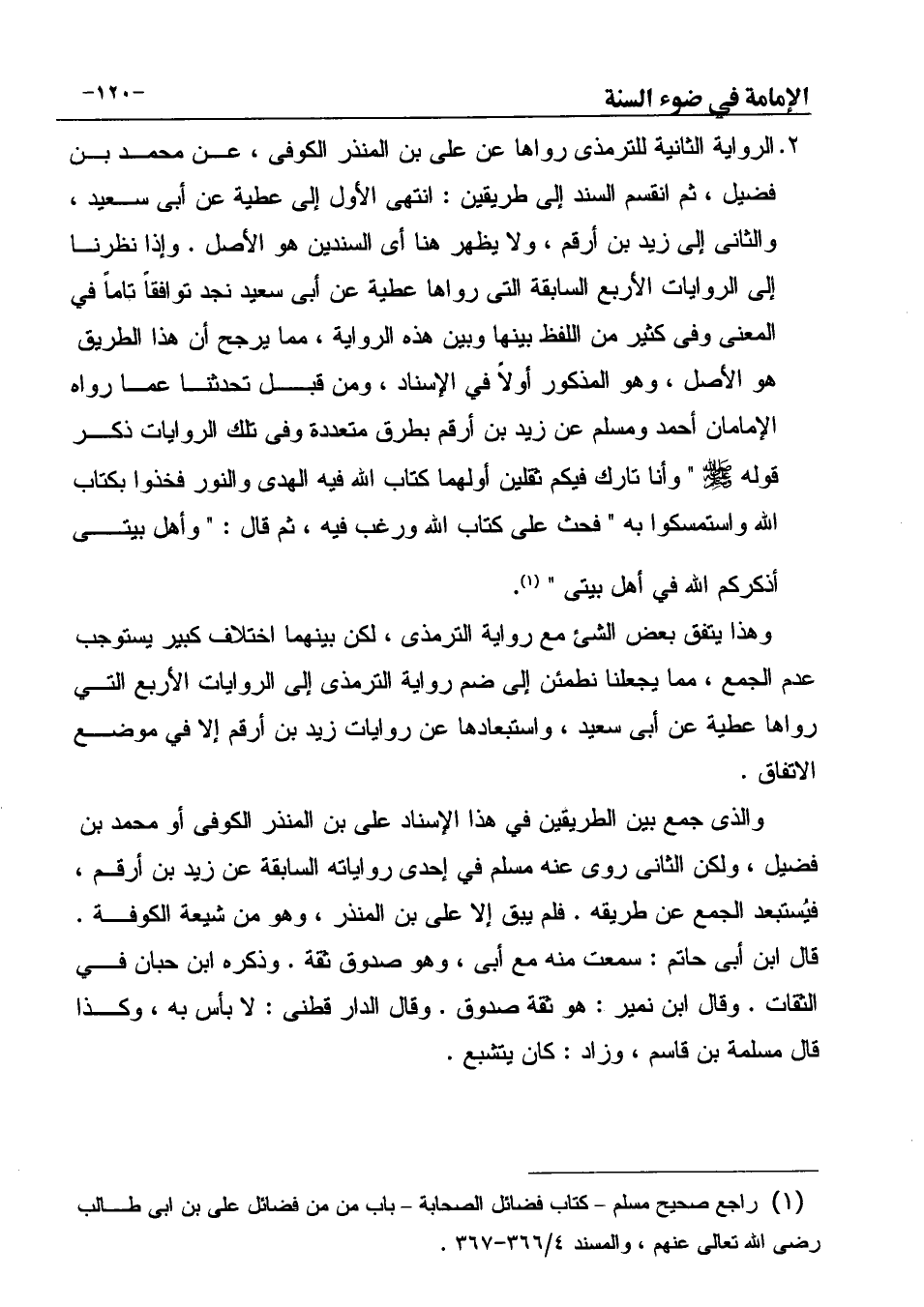 الرواية الثانية للترمذى رواها عن على بن المنذر الكوفي، عن محمد بن فضيل، ثم انقسم السند إلى طريقين: انتهى الأول إلى عطية عن أبى سعيد، والثانى إلى زيد بن أرقم، ولا يظهر هنا أي السندين هو الأصل. وإذا نظرنا إلى الروايات الأربع السابقة التي رواها عطية عن أبى سعيد نجد توافقاً تاماً في المعنى وفى كثير من اللفظ بينها وبين هذه الرواية، مما يرجح أن هذا الطريق هو الأصل، وهو المذكور أولاً في الإسناد، ومن قبل تحدثنا عما رواه الإمامان أحمد ومسلم عن زيد بن أرقم بطرق متعددة وفى تلك الروايات ذكر قوله صَلَّى اللهُ عَلَيْهِ وَسَلَّمَ " وأنا تارك فيكم ثقلين أولهما كتاب الله فيه الهدى والنور فخذوا بكتاب الله واستمسكوا به " فحث على كتاب الله ورغب فيه، ثم قال: " وأهل بيتي أذكركم الله في أهل بيتي " (¬1) .
