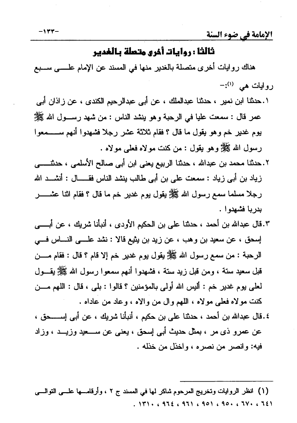 حدثنا ابن نمير، حدثنا عبد الملك، عن أبى عبد الرحيم الكندى، عن زاذان أبى عمر قال: سمعت علياً في الرحبة وهو ينشد الناس: من شهد رسول الله صَلَّى اللهُ عَلَيْهِ وَسَلَّمَ يوم غدير خم وهو يقول ما قال؟ فقام ثلاثة عشر رجلاً فشهدوا أنهم سمعوا رسول الله صَلَّى اللهُ عَلَيْهِ وَسَلَّمَ وهو يقول: من كنت مولاه فعلى مولاه.