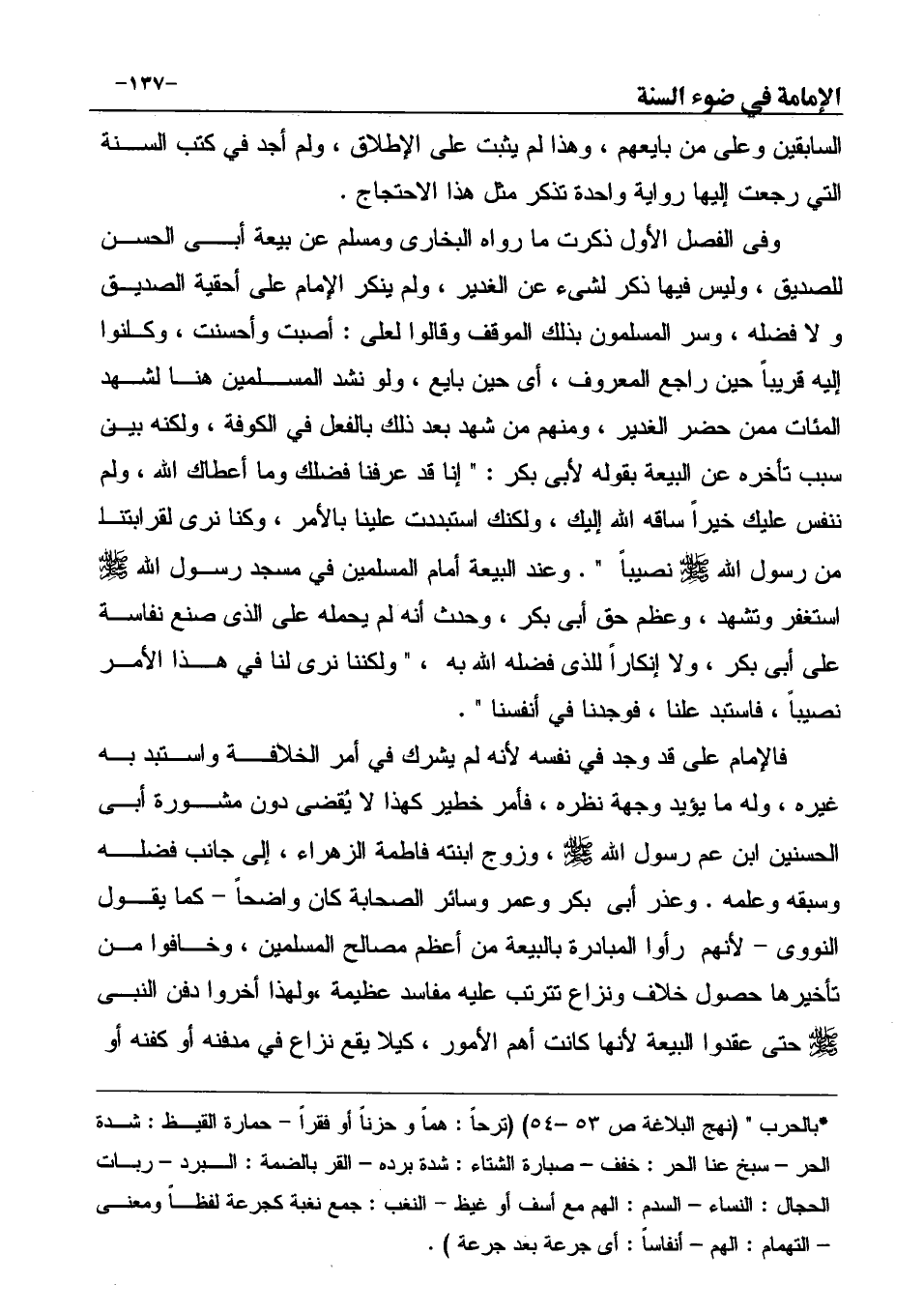 وفى الفصل الأول ذكرت ما رواه البخاري ومسلم عن بيعة أبى الحسن للصديق، وليس فيها ذكر لشىء عن الغدير، ولم ينكر الإمام على أحقية الصديق ولا فضله، وسر المسلمون بذلك الموقف وقالوا لعلى: أصبت وأحسنت، وكانوا إليه قريباً حين راجع المعروف، أي حين بايع، ولو نشد المسلمين هنا لشهد المئات ممن حضر الغدير، ومنهم من شهد بعد ذلك بالفعل في الكوفة، ولكنه بين سبب تأخره عن البيعة بقوله لأبى بكر: " إنا قد عرفنا فضلك وما أعطاك الله، ولم ننفس عليك خيراً ساقه الله إليك، ولكنك استبددت علينا بالأمر، وكنا نرى لقرابتنا من رسول الله صَلَّى اللهُ عَلَيْهِ وَسَلَّمَ نصيباً ". وعند البيعة أمام المسلمين في مسجد رسول الله صَلَّى اللهُ عَلَيْهِ وَسَلَّمَ استغفر وتشهد، وعظم حق أبى بكر، وحدث أنه لم يحمله على الذي صنع نفاسة على أبى بكر، ولا إنكاراً للذى فضله الله به، " ولكننا نرى لنا في هذا الأمر نصيباً، فاستبد علنا، فوجدنا في أنفسنا ".