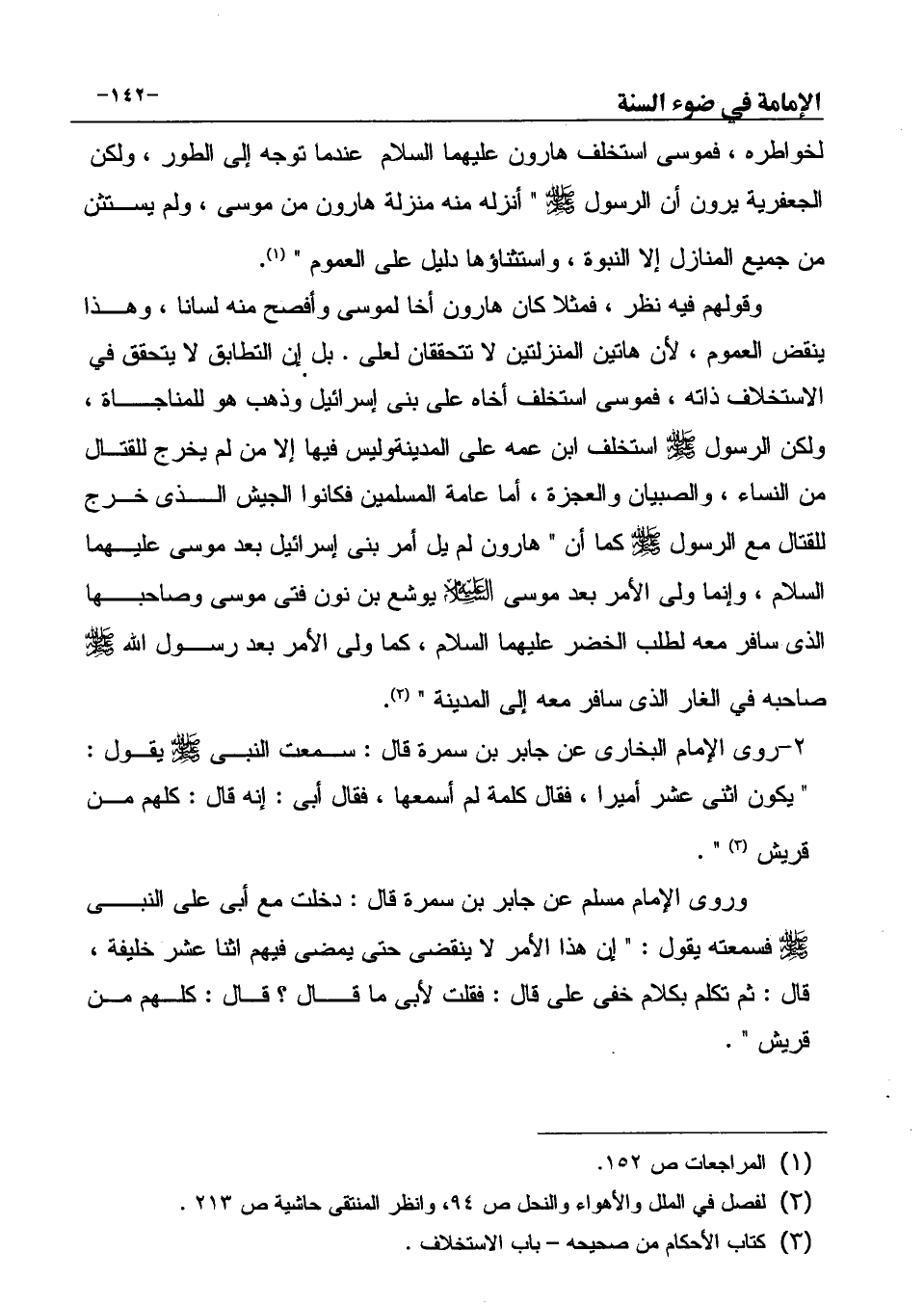 لخواطره، فموسى استخلف هارون عليهما السلام عندما توجه إلى الطور، ولكن الجعفرية يرون أن الرسول صَلَّى اللهُ عَلَيْهِ وَسَلَّمَ " أنزله منه منزلة هارون من موسى، ولم يستثن من جميع المنازل إلا النبوة، واستثناؤها دليل على العموم " (¬1) .