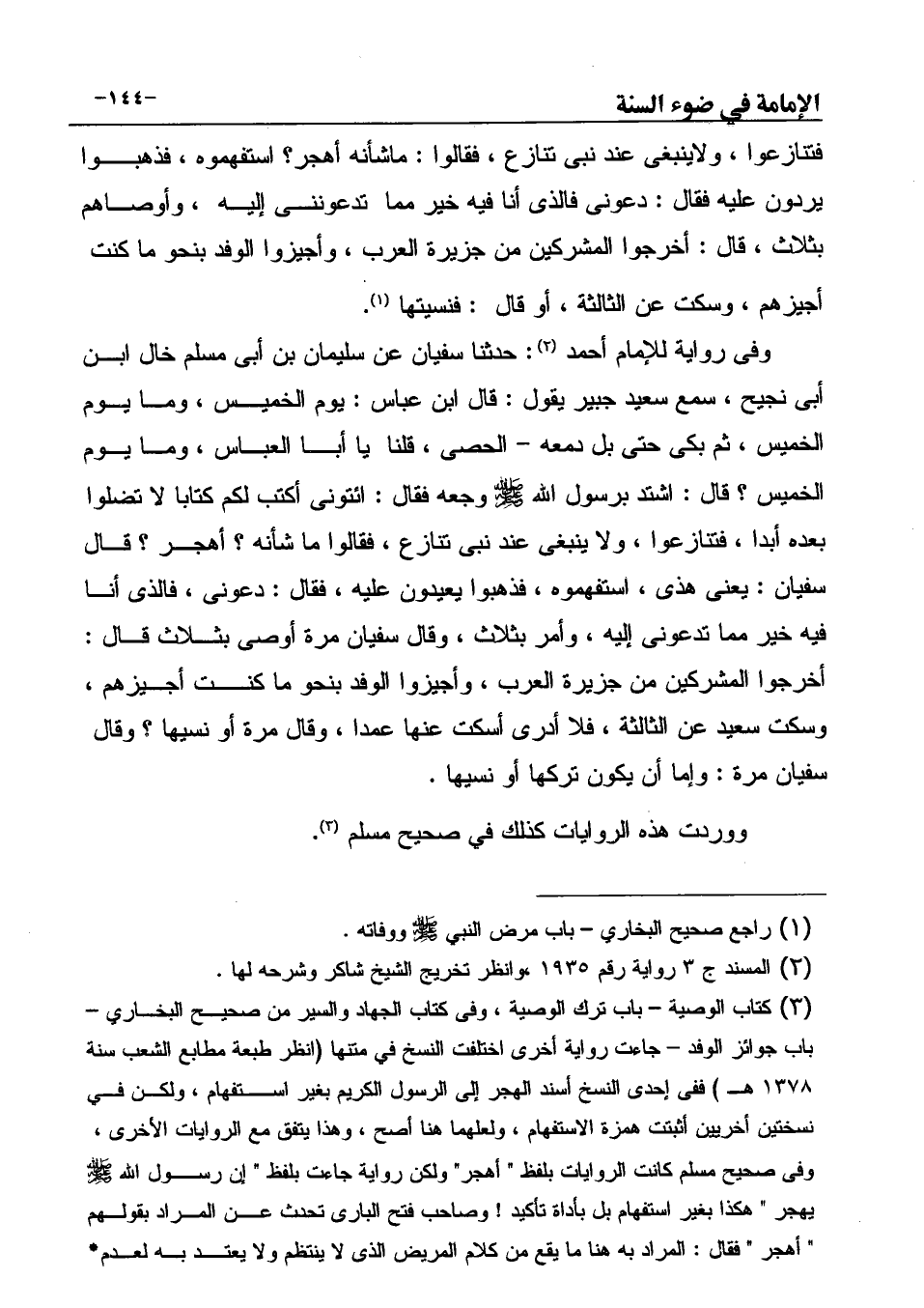 (¬1) كتاب الوصية - باب ترك الوصية، وفى كتاب الجهاد والسير من صحيح البخاري - باب جوائز الوفد - جاءت رواية أخرى اختلفت النسخ في متنها (انظر طبعة مطابع الشعب سنة 1378 هـ) ففي إحدى النسخ أسند الهجر إلى الرسول الكريم بغير استفهام، ولكن في نسختين أخريين أثبتت همزة الاستفهام، ولعلهما هنا أصح، وهذا يتفق مع الروايات الأخرى، وفى صحيح مسلم كانت الروايات بلفظ " أهجر" ولكن رواية جاءت بلفظ " إن رسول الله - صَلَّى اللهُ عَلَيْهِ وَسَلَّمَ - يهجر " هكذا بغير استفهام بل بأداة تأكيد! وصاحب فتح البارى تحدث عن المراد بقولهم ... " أهجر " فقال: المراد به هنا ما يقع من كلام المريض الذي لا ينتظم ولا يعتد به لعدم* ... *فائدته، ووقوع ذلك من النبي - صَلَّى اللهُ عَلَيْهِ وَسَلَّمَ - مستحيل، لأنه معصوم في صحته ومرضه لقوله تعالى ... (3: النجم) {وَمَا يَنطِقُ عَنِ الْهَوَى} ، ولقوله - صَلَّى اللهُ عَلَيْهِ وَسَلَّمَ -: " إنى لا أقول في الغضب والرضا إلا حقاً". وإذا عرف ذلك فإنما قاله من قاله منكراً على من توقف في امتثال أمره بإحضار الكتف والدواة، فكأنه قال: كيف تتوقف؟ أتظن أنه كغيره يقول الهذيان في مرضه؟ ويحتمل أن بعضهم قال ذلك عن شك عرض له، ولكن يبعده أن لا ينكره الباقون عليه من كونهم من كبار الصحابة ولو أنكروه عليه لنقل. ويحتمل أن يكون الذي قال ذلك صدر عن دهش وحيرة كما أصاب كثيراً منهم عند موته. ويحتمل أن يكون قائل ذلك أراد أنه اشتد وجعه فأطلق اللازم وأراد الملزوم، لأن الهذيان الذي يقع للمريض ينشأ من شدة وجعه. وقيل: قال ذلك لإرادة سكوت الذين لغطوا ورفعوا أصواتهم عنده، فكأنه قال: إن ذلك يؤذيه ويفضى في العادة إلى ما ذكره ".