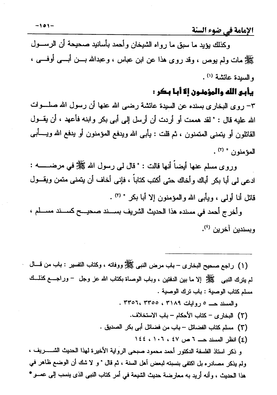 (¬4) انظر المسند حـ 6 ص 47، 106، 144 وذكر استاذ الفلسفة الدكتور أحمد محمود صبحى الرواية الأخيرة لهذا الحديث الشريف، ولم يذكر مصادره بل اكتفى بنسبته لبعض أهل السنة، ثم قال " ولا شك أن الوضع ظاهر في هذا الحديث، وأنه أريد به معارضة حديث الشيعة في أمر كتاب النبي الذي ينسب إلى عمر* *أنه منعه، ولو صح كتاب النبي إلى أبى بكر لكان نصاً جلياً لأبى بكر، وهو ما لم يقل به جمهور المسلمين "