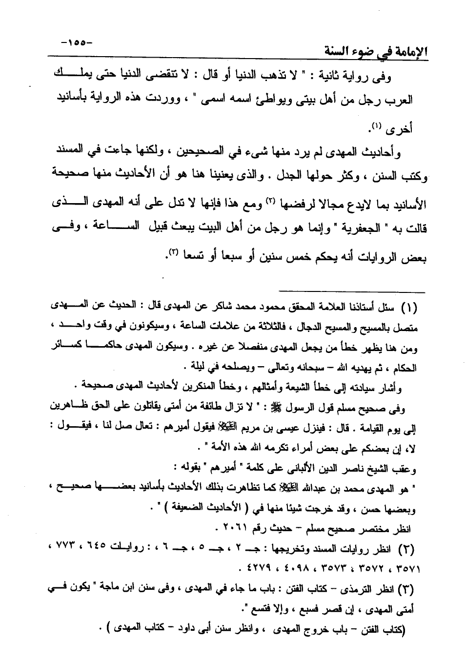 (¬1) سئل أستاذنا العلامة المحقق محمود محمد شاكر عن المهدى قال: الحديث عن المهدى متصل بالمسيح والمسيح الدجال، فالثلاثة من علامات الساعة، وسيكونون في وقت واحد، ومن هنا يظهر خطأ من يجعل المهدى منفصلاً عن غيره. وسيكون المهدى حاكماً كسائر الحكام، ثم يهديه الله - سبحانه وتعالى - ويصلحه في ليلة. وأشار سيادته إلى خطأ الشيعة وأمثالهم، وخطأ المنكرين لأحاديث المهدى صحيحة. وفى صحيح مسلم قول الرسول - صَلَّى اللهُ عَلَيْهِ وَسَلَّمَ -: " لا تزال طائفة من أمتى يقاتلون على الحق ظاهرين إلى يوم القيامة. قال: فينزل عيسى بن مريم - عليه السلام - فيقول أميرهم: تعال صل لنا، فيقول: لا، إن بعضكم على بعض أمراء تكرمه الله هذه الأمة ". وعقب الشيخ ناصر الدين الألبانى على كلمة " أميرهم " بقوله: " هو المهدى محمد بن عبد الله - عليه السلام - كما تظاهرت بذلك الأحاديث بأسانيد بعضها صحيح، وبعضها حسن، وقد خرجت شيئاً منها في (الأحاديث الضعيفة) ". انظر مختصر صحيح مسلم - حديث رقم 2061.