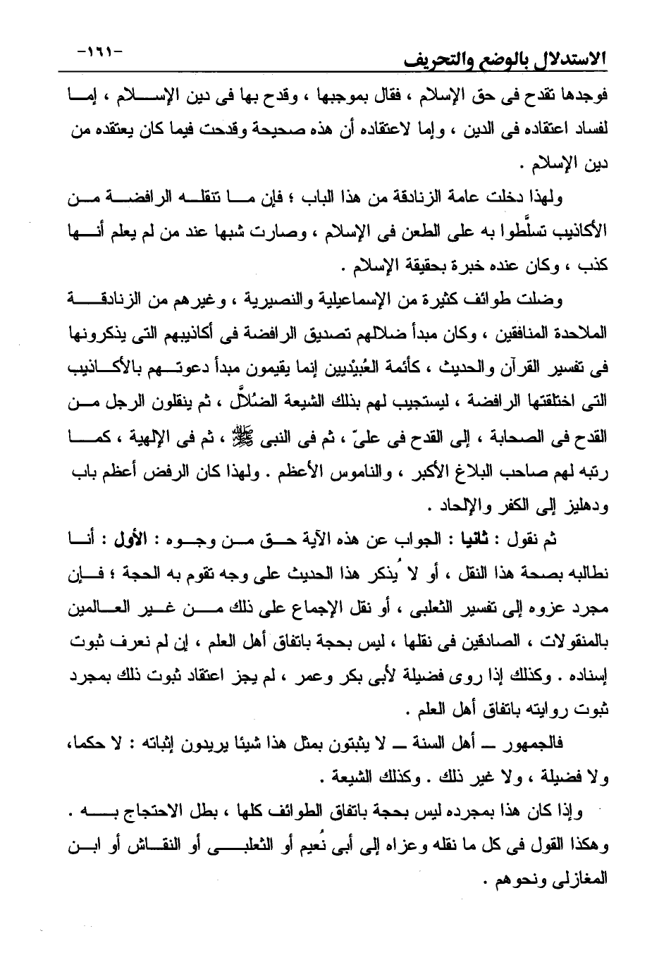 ثم نقول: ثانيا: الجواب عن هذه الآية حق من وجوه: الأول: أنا نطالبه بصحة هذا النقل، أو لا ُيذكر هذا الحديث على وجه تقوم به الحجة؛ فإن مجرد عزوه إلى تفسير الثعلبى، أو نقل الإجماع على ذلك من غير العالمين بالمنقولات، الصادقين في نقلها، ليس بحجة باتفاق أهل العلم، إن لم نعرف ثبوت إسناده. وكذلك إذا روى فضيلة لأبى بكر وعمر، لم يجز اعتقاد ثبوت ذلك بمجرد ثبوت روايته باتفاق أهل العلم.