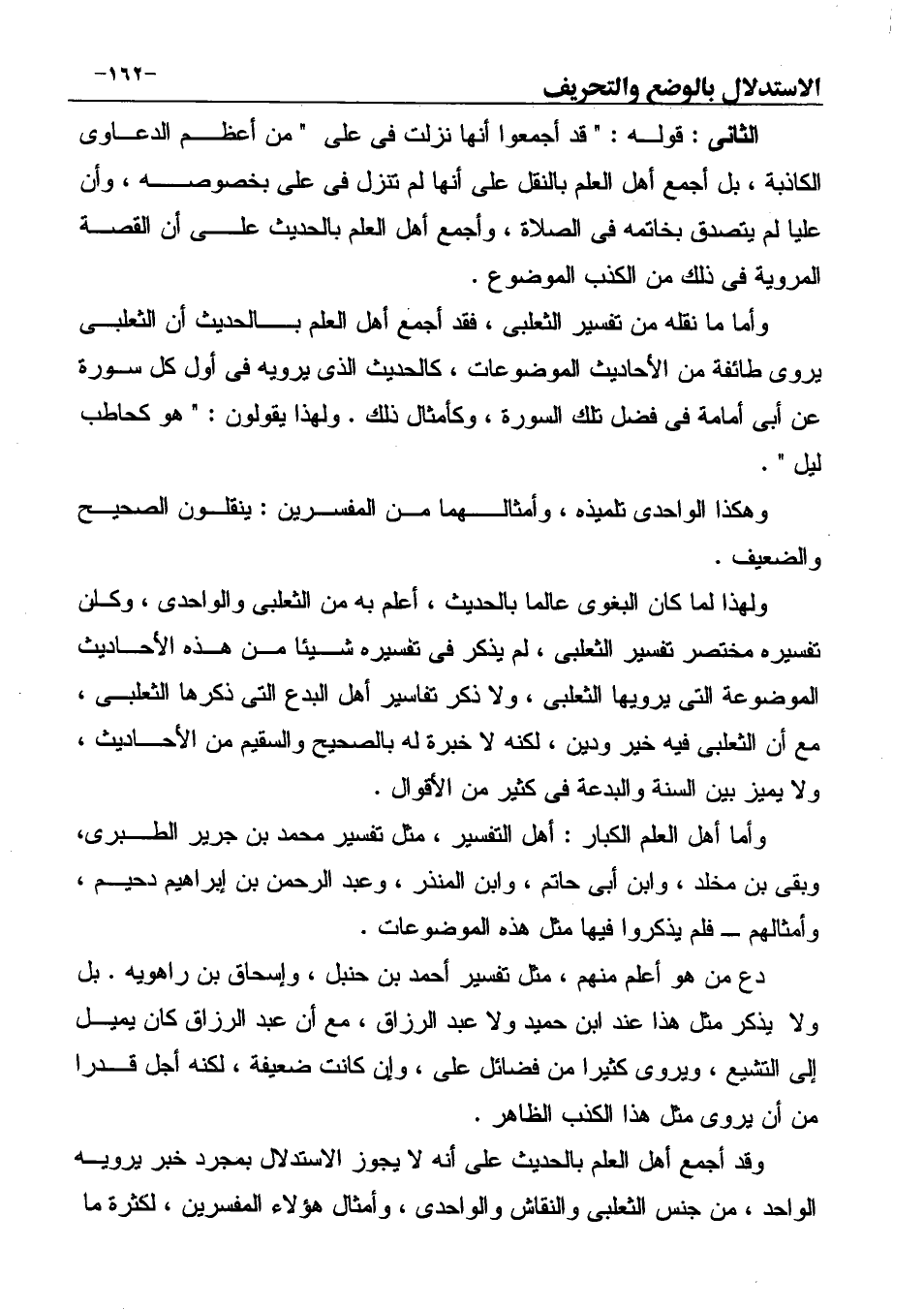 وقد أجمع أهل العلم بالحديث على أنه لا يجوز الاستدلال بمجرد خبر يرويه الواحد، من جنس الثعلبى والنقَّاش والواحدى، وأمثال هؤلاء المفسرين، لكثرة ما