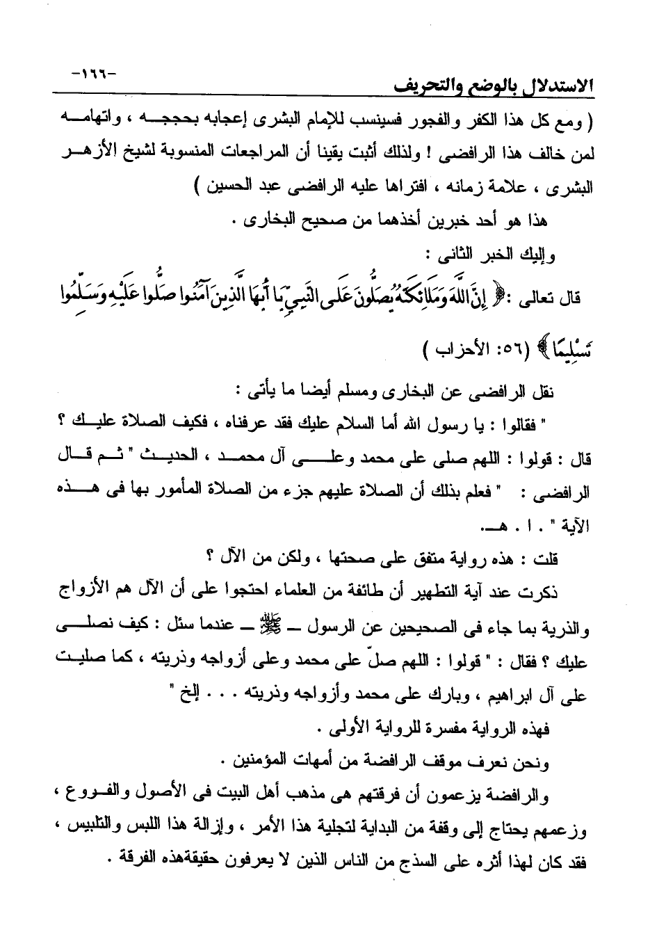 ذكرت عند آية التطهير أن طائفة من العلماء احتجوا على أن الآل هم الأزواج والذرية بما جاء في الصحيحين عن الرسول ـ صَلَّى اللهُ عَلَيْهِ وَسَلَّمَ ـ عندما سئل: كيف نصلى عليك؟ فقال: " قولوا: اللهم صلّ على محمد وعلى أزواجه وذريته، كما صليت على آل ابراهيم، وبارك على محمد وأزواجه وذريته. . . إلخ " فهذه الرواية مفسرة للرواية الأولى. ونحن نعرف موقف الرافضة من أمهات المؤمنين.