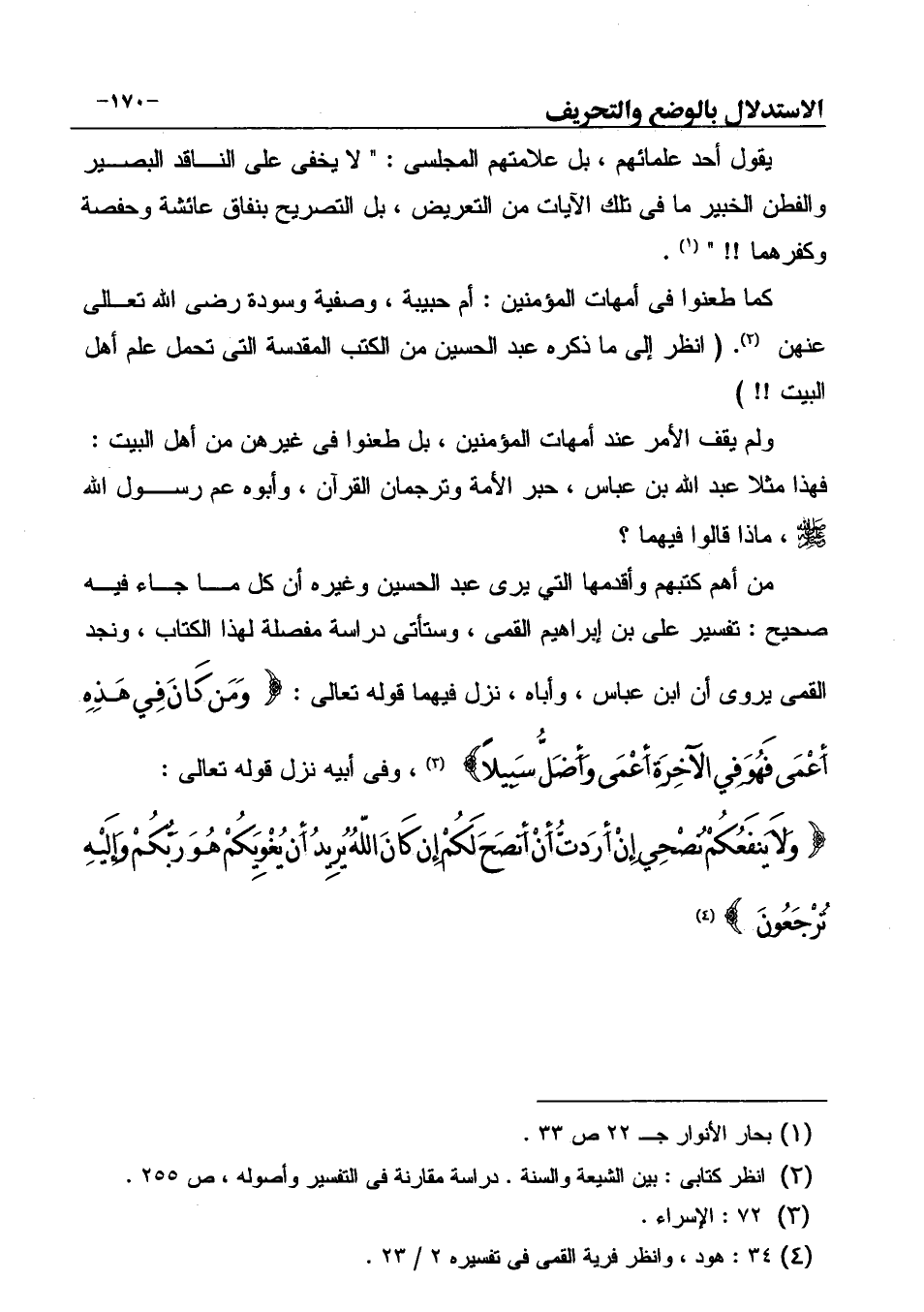 من أهم كتبهم وأقدمها التي يرى عبد الحسين وغيره أن كل ما جاء فيه صحيح: تفسير على بن إبراهيم القمي، وستأتى دراسة مفصلة لهذا الكتاب، ونجد القمي يروى أن ابن عباس، وأباه، نزل فيهما قوله تعالى: " وَمَن كَانَ فِي هَذِهِ أَعْمَى فَهُوَ فِي الآخِرَةِ أَعْمَى وَأَضَلُّ سَبِيلاً" (¬3) ، وفى أبيه نزل قوله تعالى: " وَلاَ يَنفَعُكُمْ نُصْحِي إِنْ أَرَدتُّ أَنْ أَنصَحَ لَكُمْ إِن كَانَ اللهُ يُرِيدُ أَن يُغْوِيَكُمْ هُوَ رَبُّكُمْ وَإِلَيْهِ تُرْجَعُونَ " (¬4)