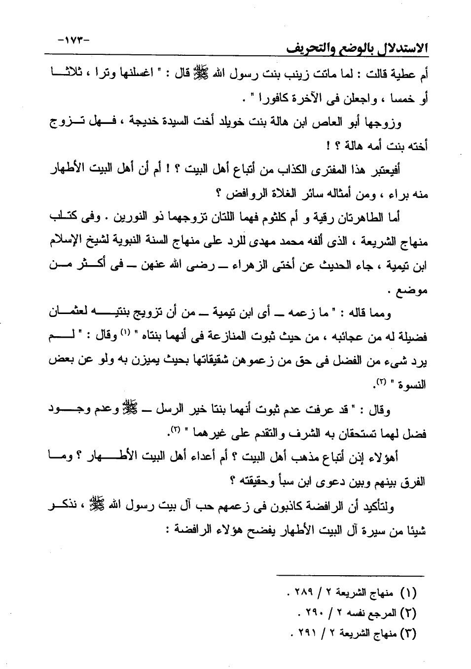 وقال: " قد عرفت عدم ثبوت أنهما بنتا خير الرسل ـ صَلَّى اللهُ عَلَيْهِ وَسَلَّمَ وعدم وجود فضل لهما تستحقان به الشرف والتقدم على غيرهما " (¬3) .