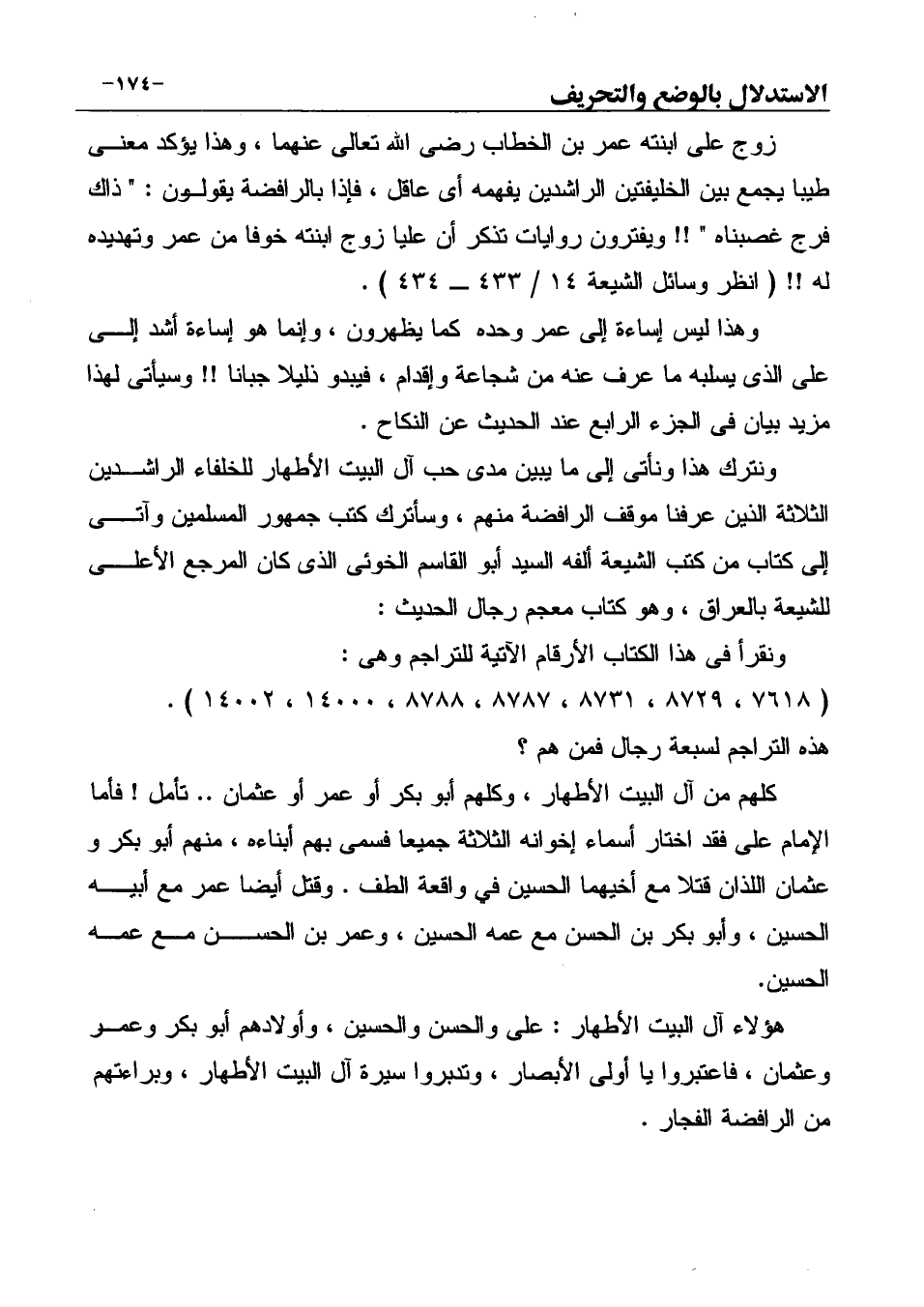 وهذا ليس إساءة إلى عمر وحده كما يظهرون، وإنما هو إساءة أشد إلى على الذي يسلبه ما عرف عنه من شجاعة وإقدام، فيبدو ذليلا جبانا!! وسيأتي لهذا مزيد بيان في الجزء الرابع عند الحديث عن النكاح.