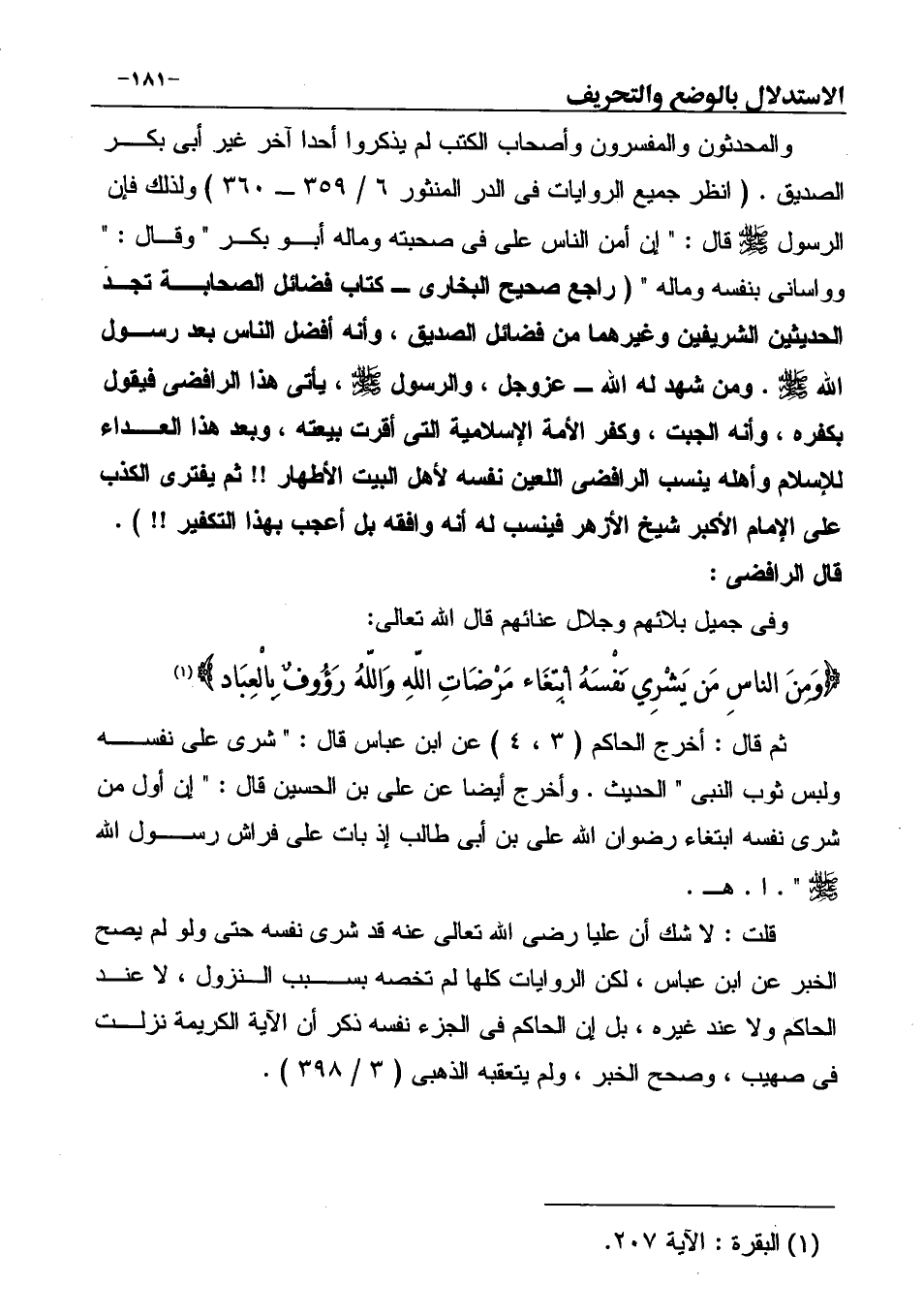 والمحدثون والمفسرون وأصحاب الكتب لم يذكروا أحدا آخر غير أبى بكر الصديق. (انظر جميع الروايات في الدر المنثور 6 / 359 ـ 360) ولذلك فإن الرسول صَلَّى اللهُ عَلَيْهِ وَسَلَّمَ قال: " إن أمن الناس على في صحبته وماله أبو بكر " وقال: " وواسانى بنفسه وماله " (راجع صحيح البخاري ـ كتاب فضائل الصحابة تجد الحديثين الشريفين وغيرهما من فضائل الصديق، وأنه أفضل الناس بعد رسول الله صَلَّى اللهُ عَلَيْهِ وَسَلَّمَ. ومن شهد له الله ـ عزوجل، والرسول صَلَّى اللهُ عَلَيْهِ وَسَلَّمَ، يأتي هذا الرافضي فيقول بكفره، وأنه الجبت، وكفر الأمة الإسلامية التي أقرت بيعته، وبعد هذا العداء للإسلام وأهله ينسب الرافضي اللعين نفسه لأهل البيت الأطهار!! ثم يفترى الكذب على الإمام الأكبر شيخ الأزهر فينسب له أنه وافقه بل أعجب بهذا التكفير!!) .