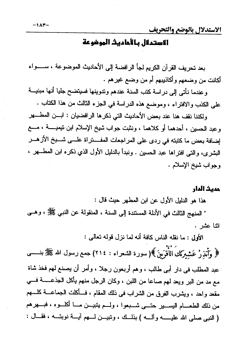 ولكننا نقف هنا عند بعض الأحاديث التي ذكرها الرافضيان: ابن المطهر وعبد الحسين، أحدهما أو كلاهما، ونثبت جواب شيخ الإسلام ابن تيمية، مع إضافة بعض ما كتبته في ردى على المراجعات المفتراة على شيخ الأزهر البشرى، والتى افتراها عبد الحسين. ونبدأ بالدليل الأول الذي ذكره ابن المطهر، وجواب شيخ الإسلام.