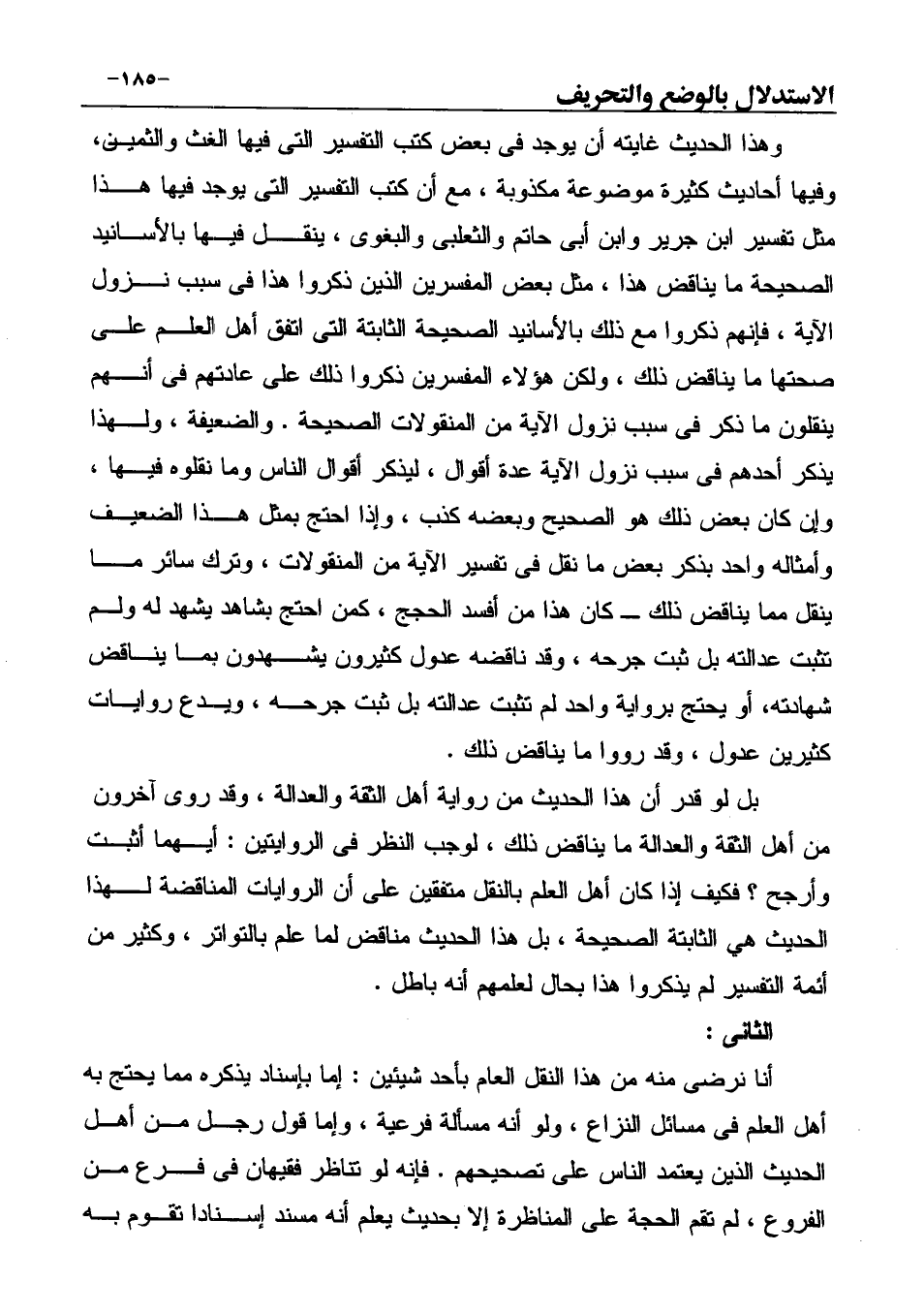 أنا نرضى منه من هذا النقل العام بأحد شيئين: إما بإسناد يذكره مما يحتج به أهل العلم في مسائل النزاع، ولو أنه مسألة فرعية، وإما قول رجل من أهل الحديث الذين يعتمد الناس على تصحيحهم. فإنه لو تناظر فقيهان في فرع من الفروع، لم تقم الحجة على المناظرة إلا بحديث يعلم أنه مسند إسناداً تقوم به