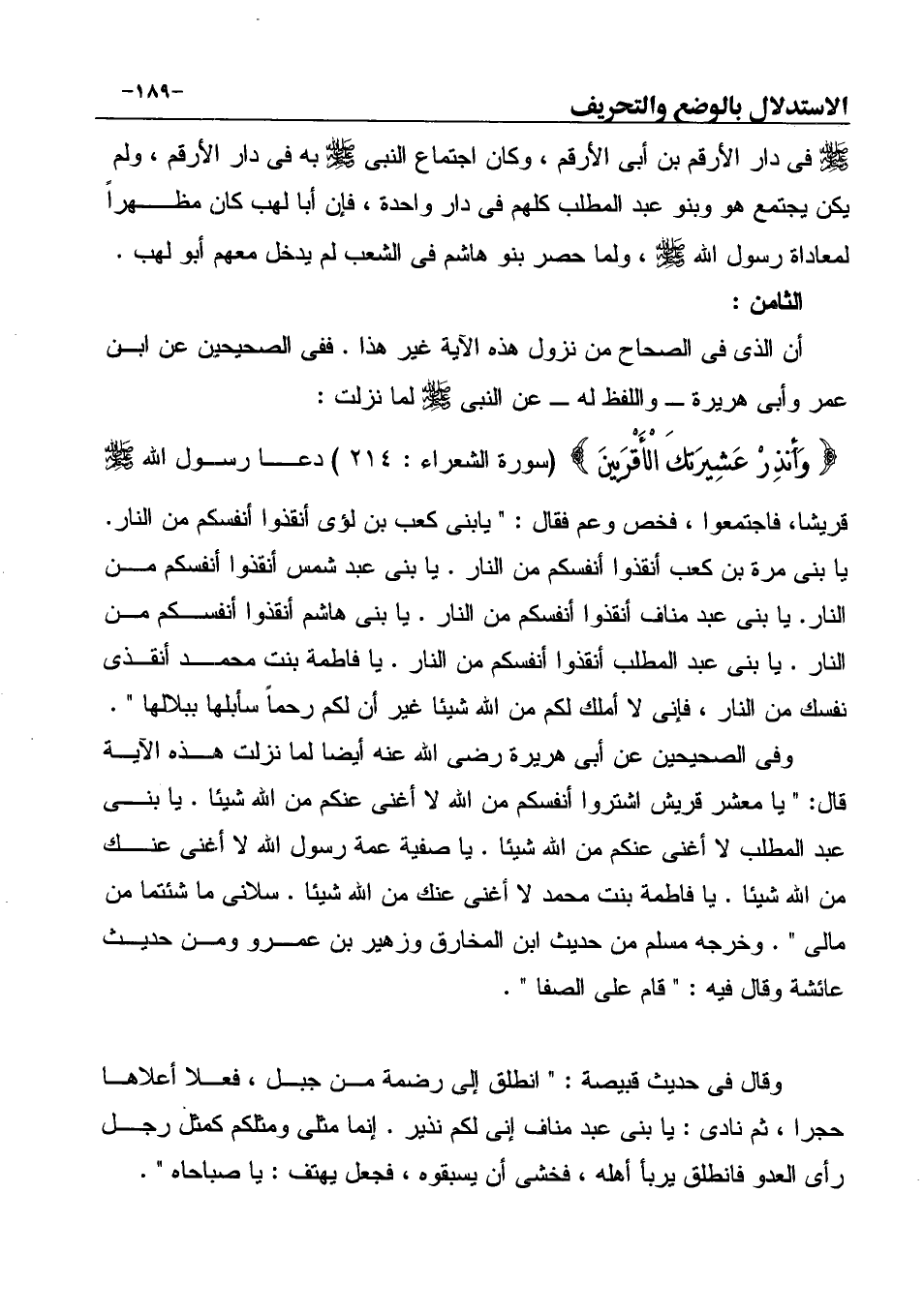 أن الذي في الصحاح من نزول هذه الآية غير هذا. ففي الصحيحين عن ابن عمر وأبى هريرة ـ واللفظ له ـ عن النبي صَلَّى اللهُ عَلَيْهِ وَسَلَّمَ لما نزلت: " وَأَنذِرْ عَشِيرَتكَ الْأَقْرَبِينَ " (سورة الشعراء: 214) دعا رسول الله صَلَّى اللهُ عَلَيْهِ وَسَلَّمَ قريشا، فاجتمعوا، فخص وعم فقال: " يابنى كعب بن لؤى أنقذوا أنفسكم من النار. يا بنى مرة بن كعب أنقذوا أنفسكم من النار. يا بنى عبد شمس أنقذوا أنفسكم من النار. يا بنى عبد مناف أنقذوا أنفسكم من النار. يا بنى هاشم أنقذوا أنفسكم من النار. يا بنى عبد المطلب أنقذوا أنفسكم من النار. يا فاطمة بنت محمد أنقذى نفسك من النار، فإنى لا أملك لكم من الله شيئا غير أن لكم رحماً سأبلها ببلالها ".