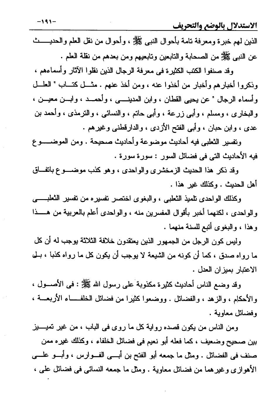 وقد وضع الناس أحاديث كثيرة مكذوبة على رسول الله صَلَّى اللهُ عَلَيْهِ وَسَلَّمَ: في الأصول، والأحكام، والزهد، والفضائل. ووضعوا كثيرا من فضائل الخلفاء الأربعة، وفضائل معاوية.