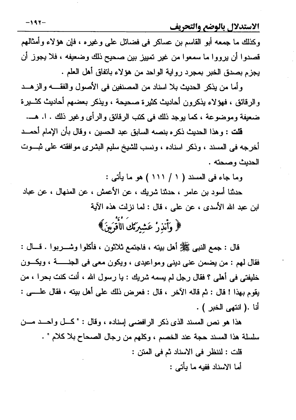 وما جاء في المسند (1 / 111) هو ما يأتي: حدثنا أسود بن عامر، حدثنا شريك، عن الأعمش، عن المنهال، عن عباد ابن عبد الله الأسدي، عن على، قال: لما نزلت هذه الآية " وَأَنذِرْ عَشِيرَتَكَ الْأَقْرَبِينَ". قال: جمع النبي صَلَّى اللهُ عَلَيْهِ وَسَلَّمَ أهل بيته، فاجتمع ثلاثون، فأكلوا وشربوا. قال: فقال لهم: من يضمن عنى دينى ومواعيدى، ويكون معى في الجنة، ويكون خليفتى في أهلي؟ فقال رجل لم يسمه شريك: يا رسول الله، أنت كنت بحرا، من يقوم بهذا! قال: ثم قاله الآخر، قال: فعرض ذلك على أهل بيته، فقال على: أنا. (انتهى الخبر) .