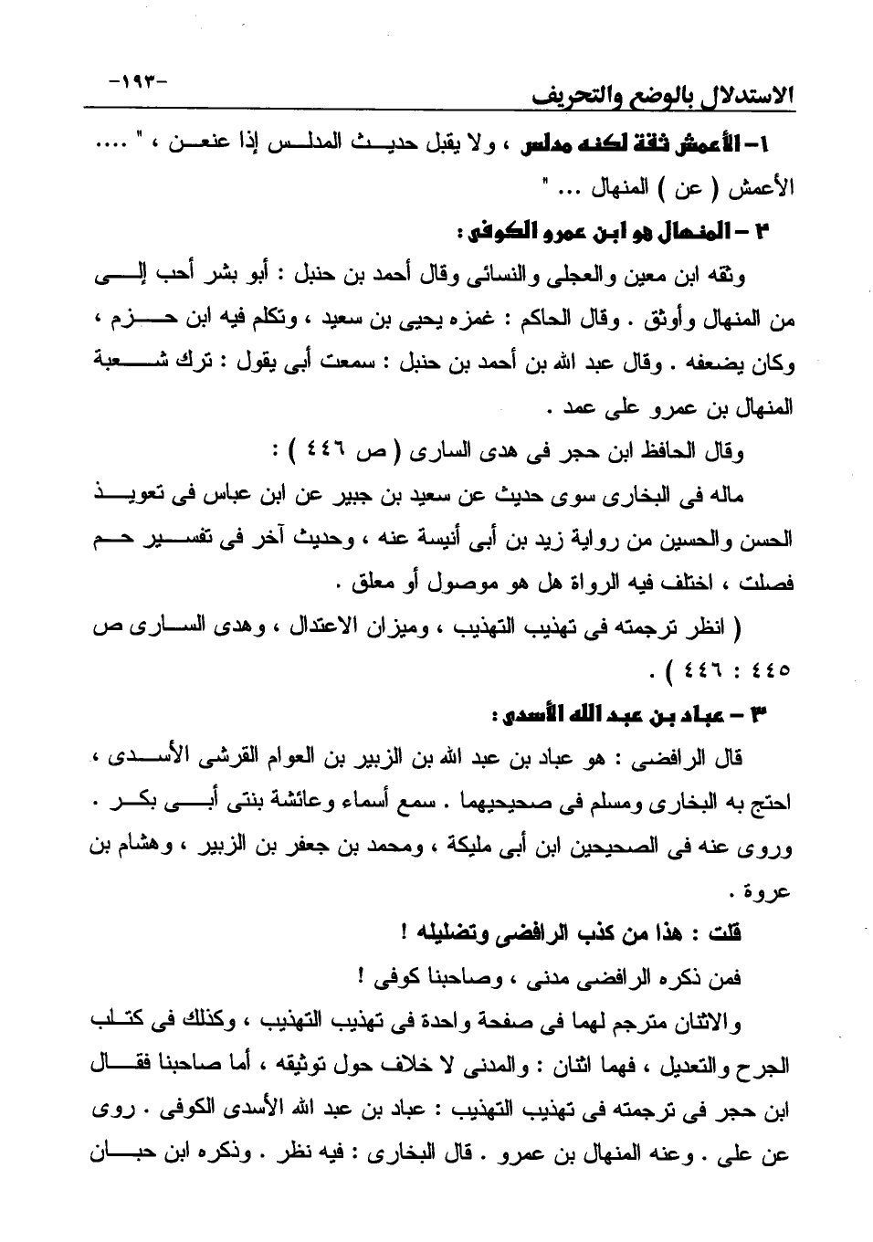 والاثنان مترجم لهما في صفحة واحدة في تهذيب التهذيب، وكذلك في كتاب الجرح والتعديل، فهما اثنان: والمدني لا خلاف حول توثيقه، أما صاحبنا فقال ابن حجر في ترجمته في تهذيب التهذيب: عباد بن عبد الله الأسدي الكوفي. روى عن على. وعنه المنهال بن عمرو. قال البخاري: فيه نظر. وذكره ابن حبان