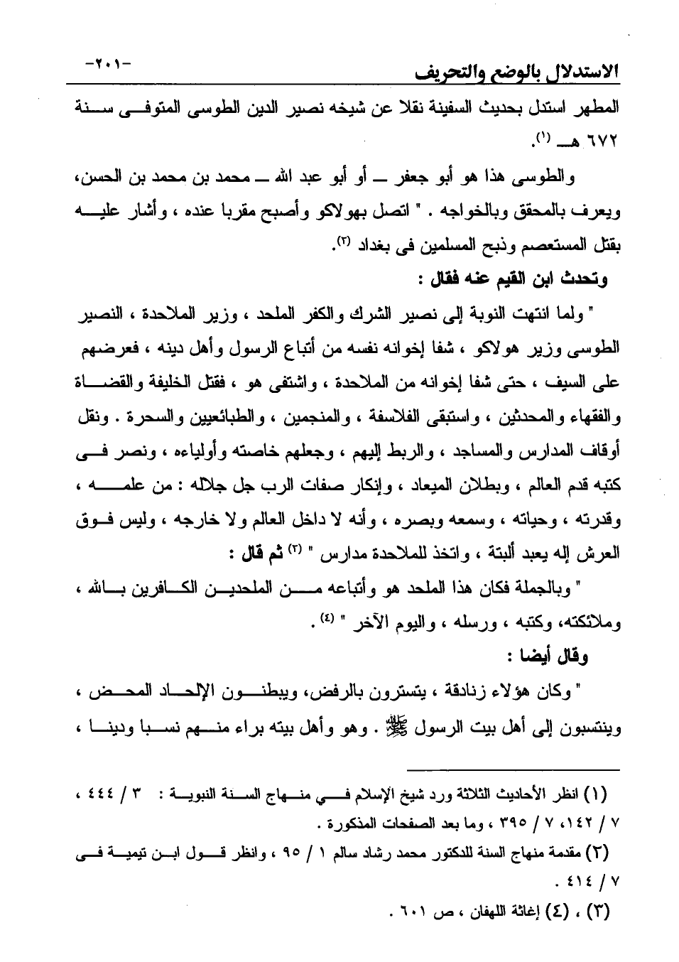" وبالجملة فكان هذا الملحد هو وأتباعه من الملحدين الكافرين بالله، وملائكته، وكتبه، ورسله، واليوم الآخر " (¬4) .