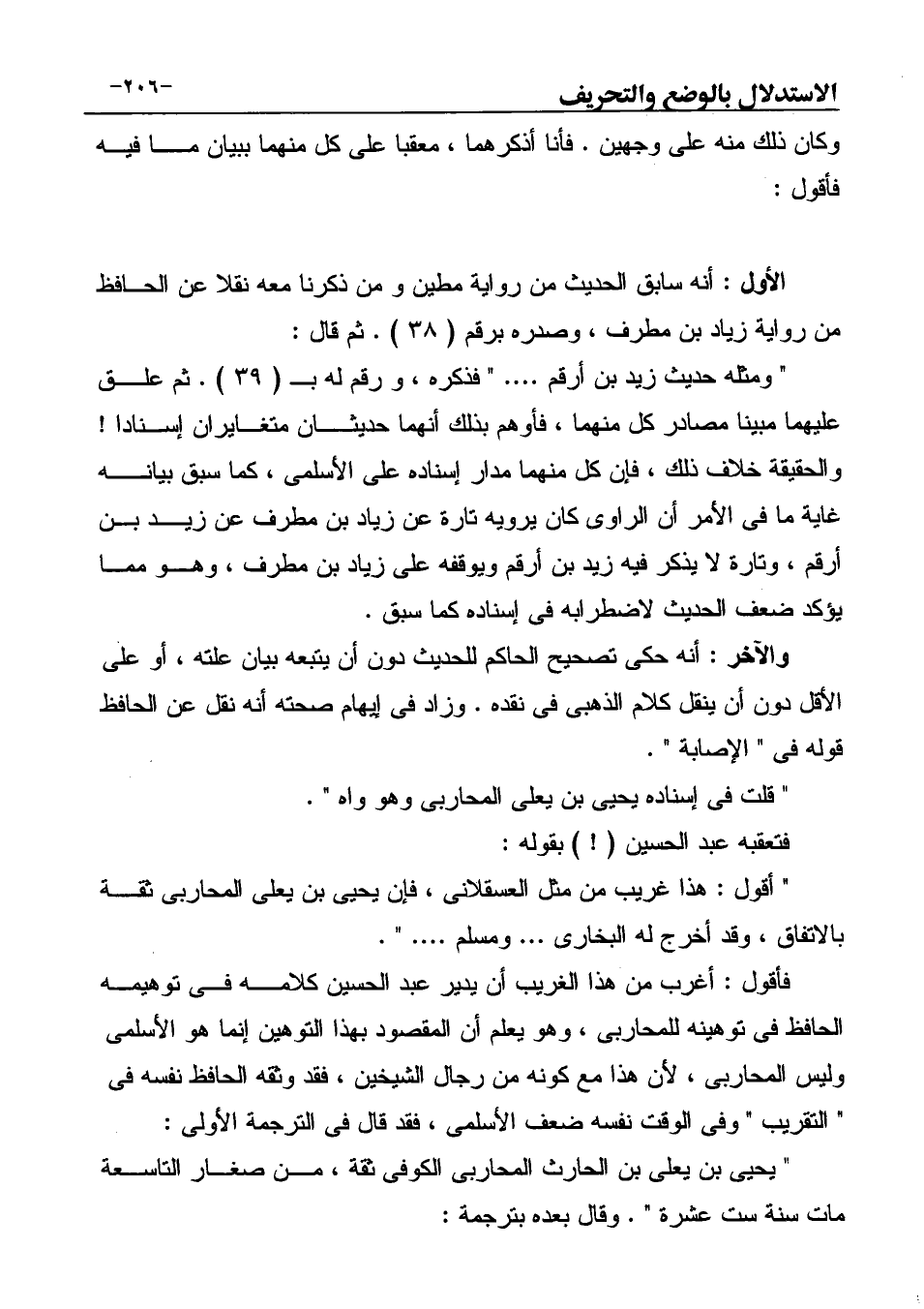 فتعقبه عبد الحسين (!) بقوله: " أقول: هذا غريب من مثل العسقلانى، فإن يحيى بن يعلى المحاربى ثقة بالاتفاق، وقد أخرج له البخاري ... ومسلم.... ".