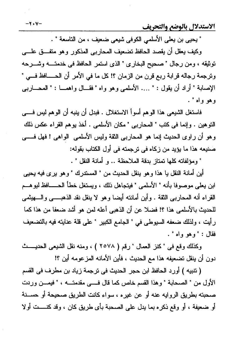 فاستغل الشيعي هذا الوهم أسوأ الاستغلال. فبدل أن ينبه أن الوهم ليس في التوهين. وإنما في كتب " المحاربى " مكان الأسلمى. أخذ يوهم القراء عكس ذلك وهو أن راوى الحديث إنما هو المحاربى الثقة وليس الأسلمى الواهى! فهل في صنيعه هذا ما يؤيد من زكاه في ترجمته في أول الكتاب بقوله:
