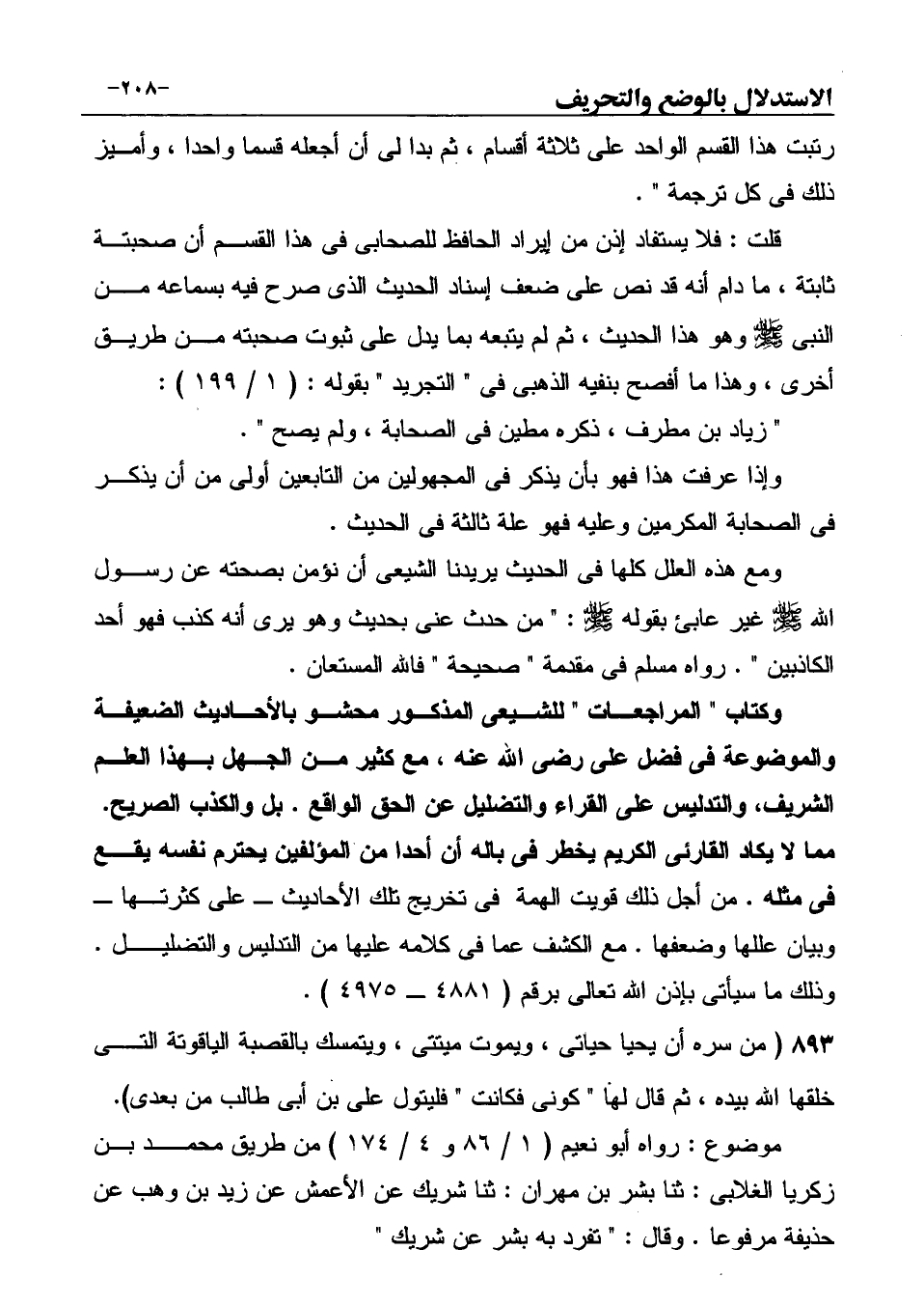 وكتاب " المراجعات " للشيعى المذكور محشو بالأحاديث الضعيفة والموضوعة في فضل على رضي الله عنه، مع كثير من الجهل بهذا العلم الشريف، والتدليس على القراء والتضليل عن الحق الواقع. بل والكذب الصريح. مما لا يكاد القارئى الكريم يخطر في باله أن أحدا من المؤلفين يحترم نفسه يقع في مثله. من أجل ذلك قويت الهمة في تخريج تلك الأحاديث ـ على كثرتها ـ وبيان عللها وضعفها. مع الكشف عما في كلامه عليها من التدليس والتضليل. وذلك ما سيأتي بإذن الله تعالى برقم (4881 ـ 4975) .