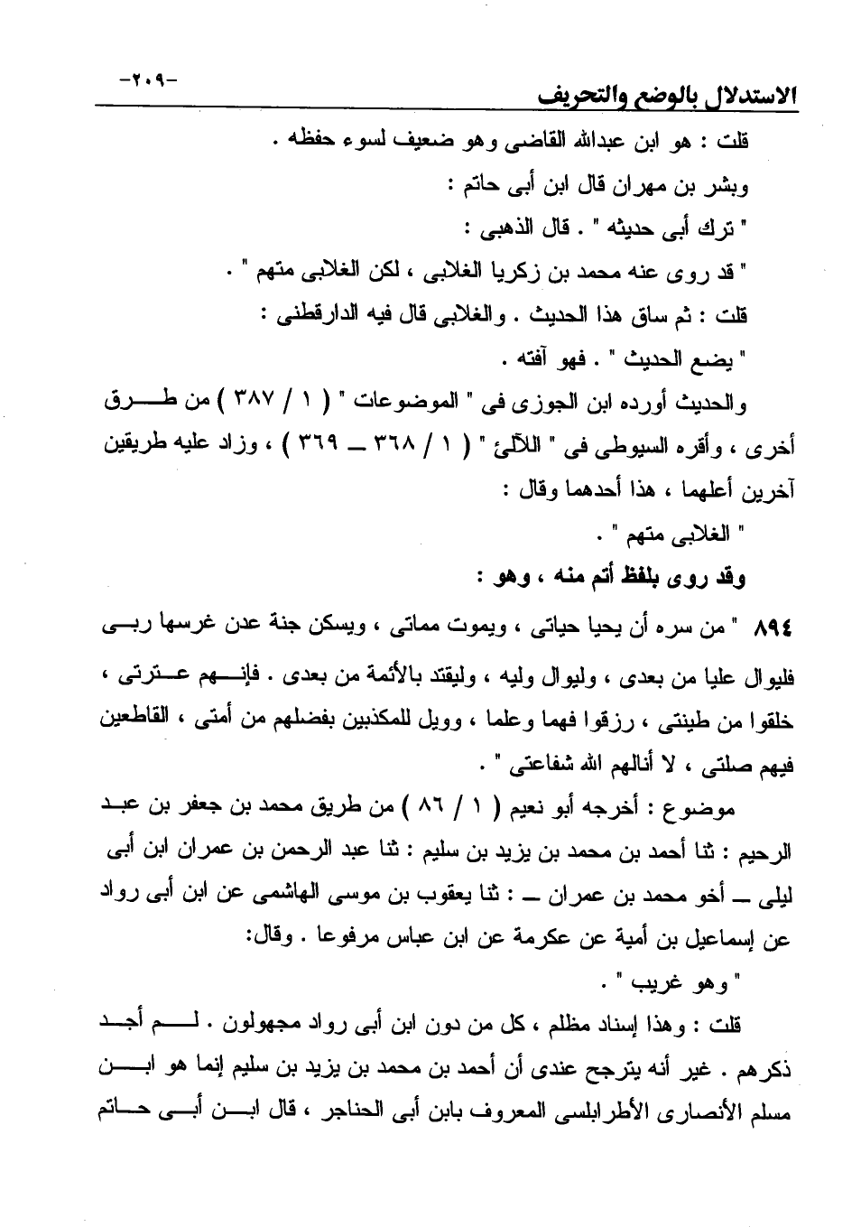وبشر بن مهران قال ابن أبى حاتم: " ترك أبى حديثه ". قال الذهبي: " قد روى عنه محمد بن زكريا الغلابى، لكن الغلابى متهم ". قلت: ثم ساق هذا الحديث. والغلابى قال فيه الدارقطنى: " يضع الحديث ". فهو آفته.