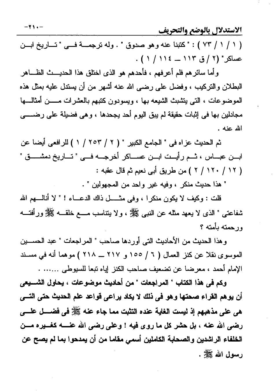 وكم في هذا الكتاب " المراجعات " من أحاديث موضوعات، يحاول الشيعي أن يوهم القراء صحتها وهو في ذلك لا يكاد يراعى قواعد علم الحديث حتى التي هي على مذهبهم إذ ليست الغاية عنده التثبت مما جاء عنه صَلَّى اللهُ عَلَيْهِ وَسَلَّمَ في فضل على رضي الله عنه، بل حشر كل ما روى فيه! وعلى رضي الله عنه كغيره من الخلفاء الراشدين والصحابة الكاملين أسمي مقاما من أن يمدحوا بما لم يصح عن رسول الله صَلَّى اللهُ عَلَيْهِ وَسَلَّمَ.