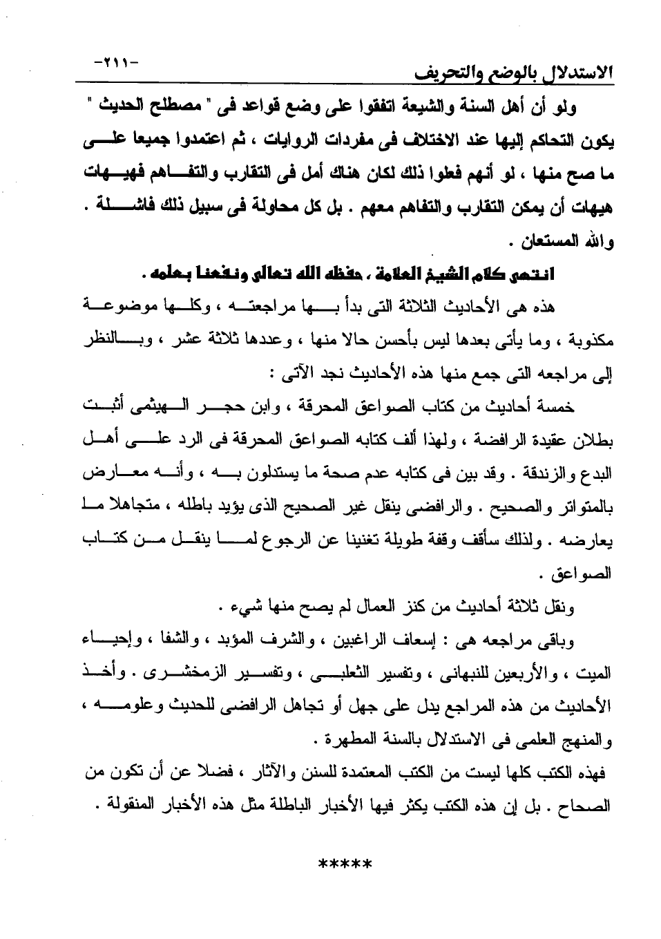 ولو أن أهل السنة والشيعة اتفقوا على وضع قواعد في " مصطلح الحديث " يكون التحاكم إليها عند الاختلاف في مفردات الروايات، ثم اعتمدوا جميعا على ما صح منها، لو أنهم فعلوا ذلك لكان هناك أمل في التقارب والتفاهم فهيهات هيهات أن يمكن التقارب والتفاهم معهم. بل كل محاولة في سبيل ذلك فاشلة. والله المستعان.