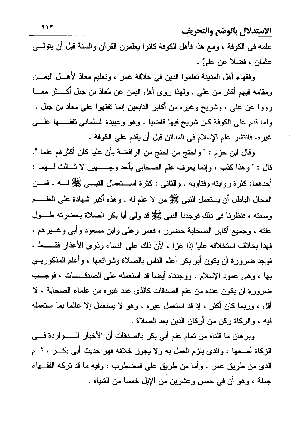 وقال ابن حزم: " واحتج من احتج من الرافضة بأن عليا كان أكثرهم علما ". قال: " وهذا كذب، وإنما يعرف علم الصحابى بأحد وجهين لا ثالث لهما: أحدهما: كثرة روايته وفتاويه. والثانى: كثرة استعمال النبي صَلَّى اللهُ عَلَيْهِ وَسَلَّمَ له. فمن المحال الباطل أن يستعمل النبي صَلَّى اللهُ عَلَيْهِ وَسَلَّمَ من لا علم له. وهذه أكبر شهادة على العلم وسعته، فنظرنا في ذلك فوجدنا النبي صَلَّى اللهُ عَلَيْهِ وَسَلَّمَ قد ولى أبا بكر الصلاة بحضرته طول علته، وجميع أكابر الصحابة حضور، فعمر وعلى وابن مسعود وأبى وغيرهم، فهذا بخلاف استخلافه عليا إذا غزا، لأن ذلك على النساء وذوى الأعذار فقط، فوجد ضرورة أن يكون أبو بكر أعلم الناس بالصلاة وشرائعها، وأعلم المذكورين بها، وهى عمود الإسلام. ووجدناه أيضا قد استعمله على الصدقات، فوجب ضرورة أن يكون عنده من علم الصدقات كالذى عند غيره من علماء الصحابة، لا أقل، وربما كان أكثر، إذ قد استعمل غيره، وهو لا يستعمل إلا عالما بما استعمله فيه، والزكاة ركن من أركان الدين بعد الصلاة.